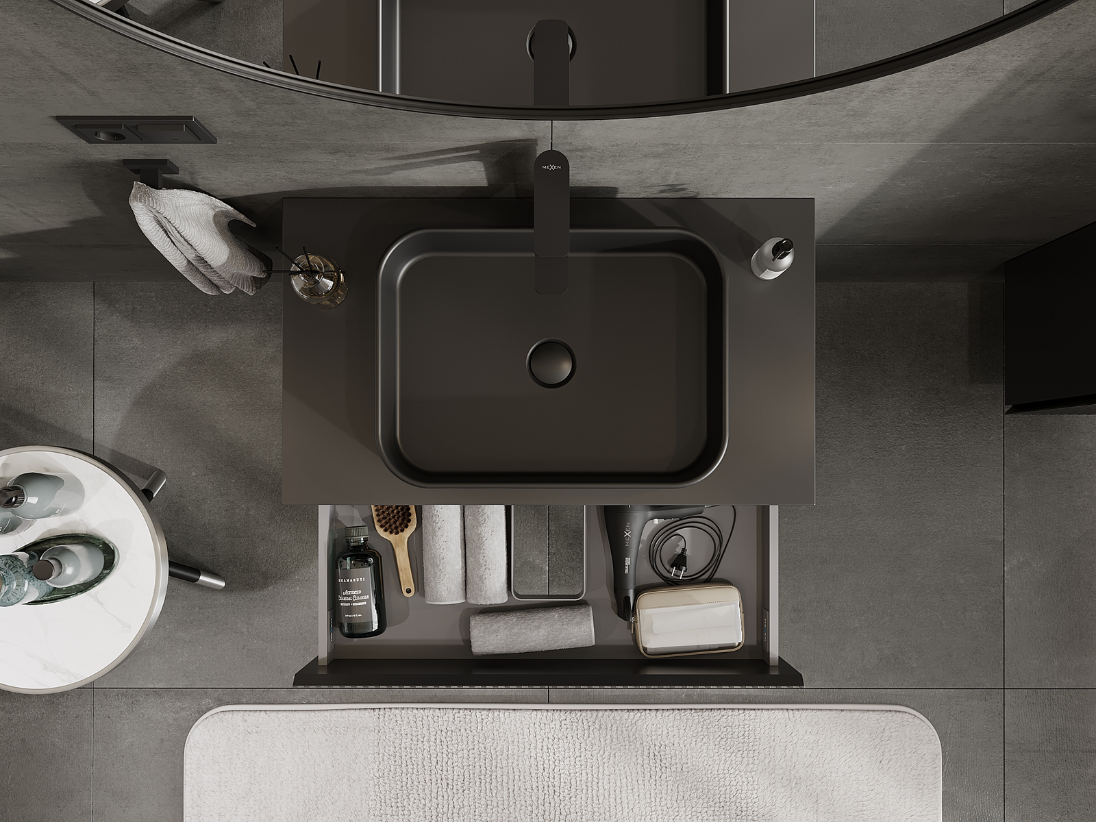 Der Ausschnitt in der Schublade ist so gestaltet, dass er den Siphon aufnehmen kann, der für Waschbeckeninstallationen erforderlich ist. Dadurch kann das Möbelstück voll funktionsfähig montiert werden, ohne auf den Platz in der Schublade zugunsten der Installation verzichten zu müssen.