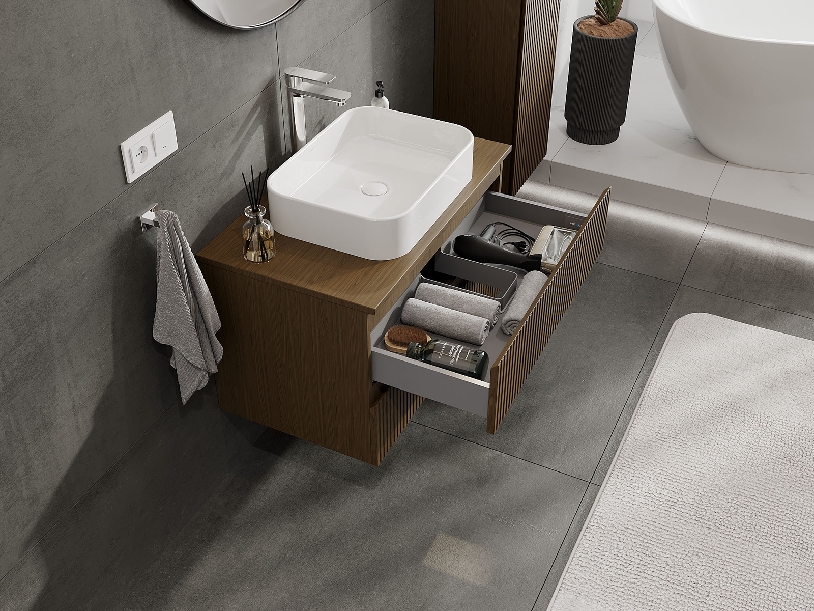 Unsere modularen Badezimmermöbel können in verschiedenen Farbkonfigurationen miteinander kombiniert werden, wodurch eine vollständige Personalisierung ermöglicht wird. Man kann sowohl das Aussehen als auch die Funktionen der einzelnen Elemente auswählen, was es erlaubt, die Möbel an eigene stilistische und funktionale Vorlieben anzupassen.