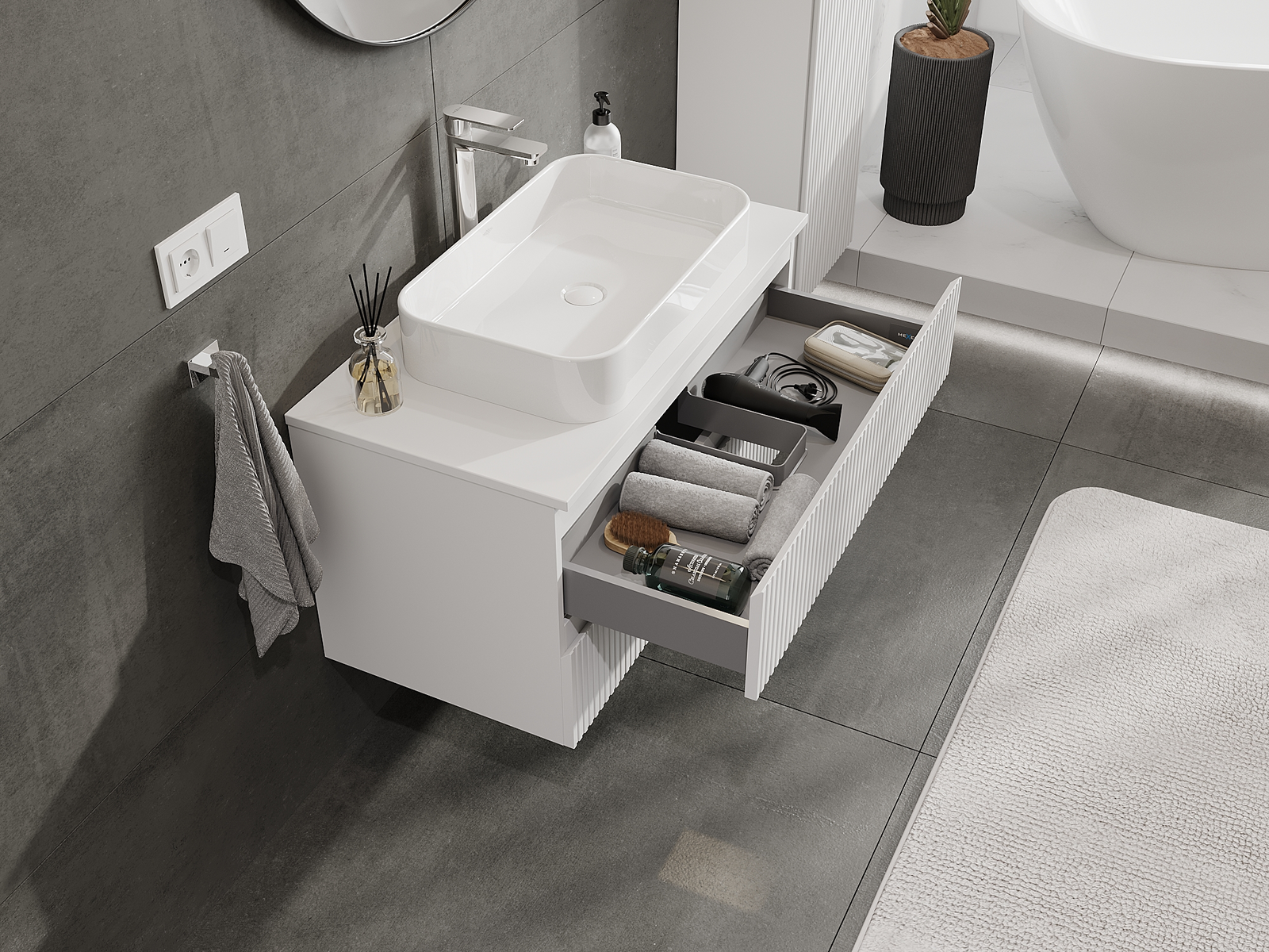 Unsere modularen Badezimmermöbel können in verschiedenen Farbkonfigurationen miteinander kombiniert werden, wodurch eine vollständige Personalisierung ermöglicht wird. Man kann sowohl das Aussehen als auch die Funktionen der einzelnen Elemente auswählen, was es erlaubt, die Möbel an eigene stilistische und funktionale Vorlieben anzupassen.