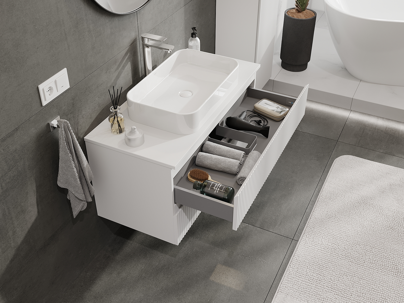 Unsere modularen Badezimmermöbel können in verschiedenen Farbkonfigurationen miteinander kombiniert werden, wodurch eine vollständige Personalisierung ermöglicht wird. Man kann sowohl das Aussehen als auch die Funktionen der einzelnen Elemente auswählen, was es erlaubt, die Möbel an eigene stilistische und funktionale Vorlieben anzupassen.