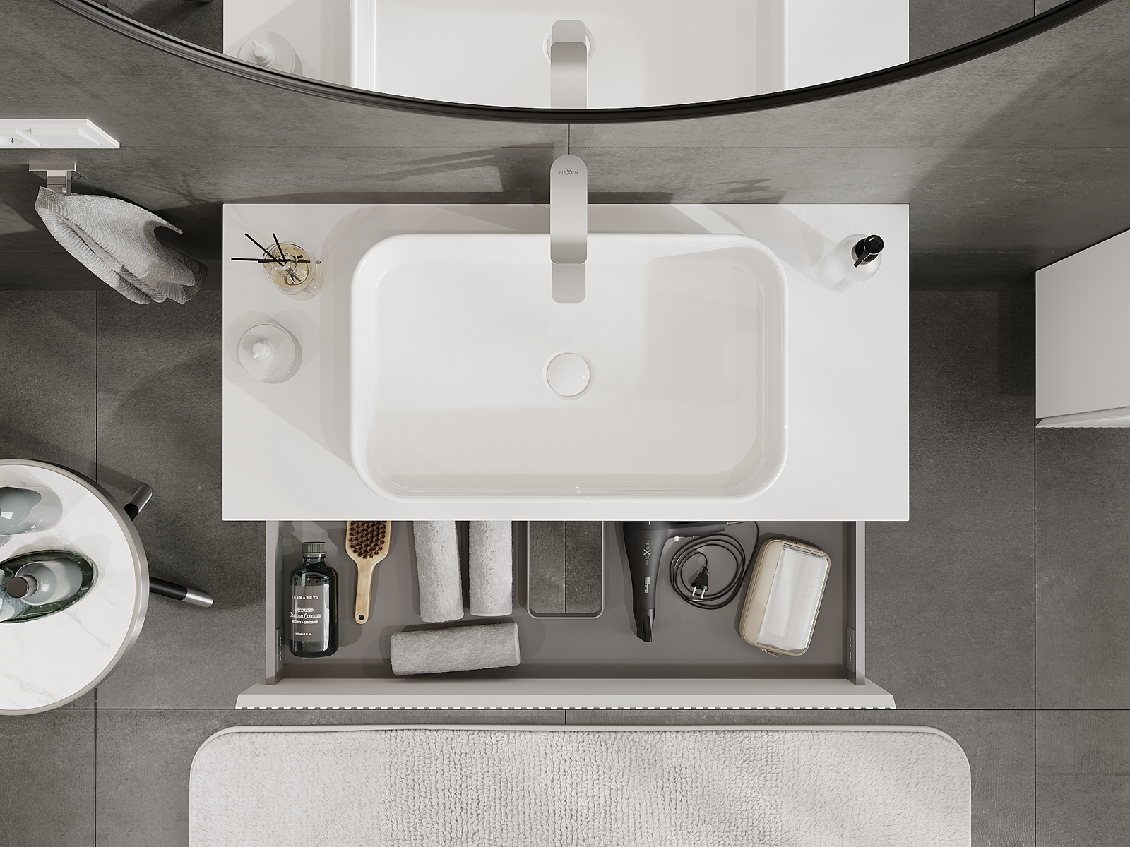 Der Ausschnitt in der Schublade ist so gestaltet, dass er den Siphon aufnehmen kann, der für Waschbeckeninstallationen erforderlich ist. Dadurch kann das Möbelstück voll funktionsfähig montiert werden, ohne auf den Platz in der Schublade zugunsten der Installation verzichten zu müssen.