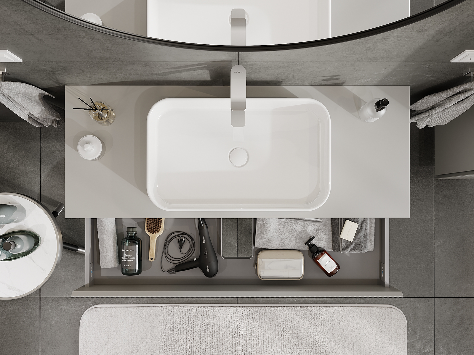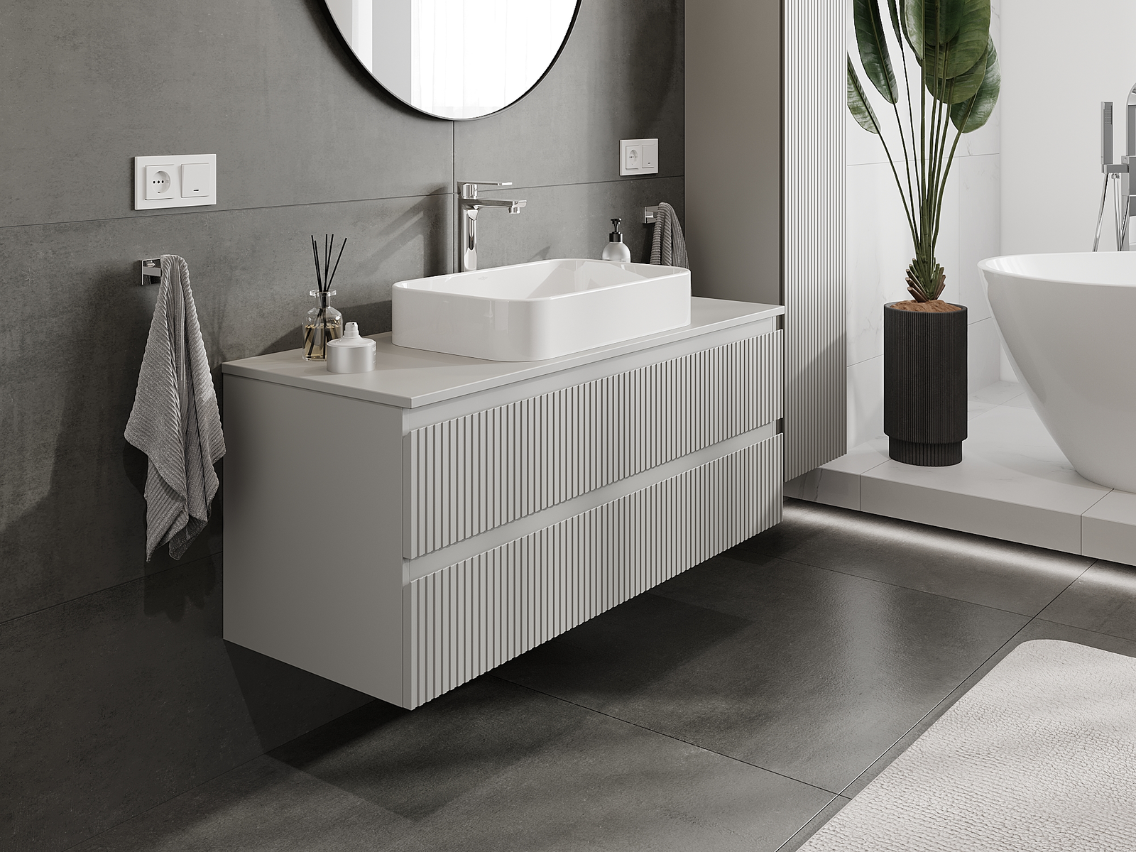 Unsere modularen Badezimmermöbel können in verschiedenen Farbkonfigurationen miteinander kombiniert werden, wodurch eine vollständige Personalisierung ermöglicht wird. Man kann sowohl das Aussehen als auch die Funktionen der einzelnen Elemente auswählen, was es erlaubt, die Möbel an eigene stilistische und funktionale Vorlieben anzupassen.