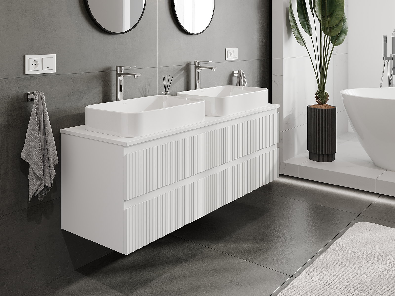 Unsere modularen Badezimmermöbel können in verschiedenen Farbkonfigurationen miteinander kombiniert werden, wodurch eine vollständige Personalisierung ermöglicht wird. Man kann sowohl das Aussehen als auch die Funktionen der einzelnen Elemente auswählen, was es erlaubt, die Möbel an eigene stilistische und funktionale Vorlieben anzupassen.