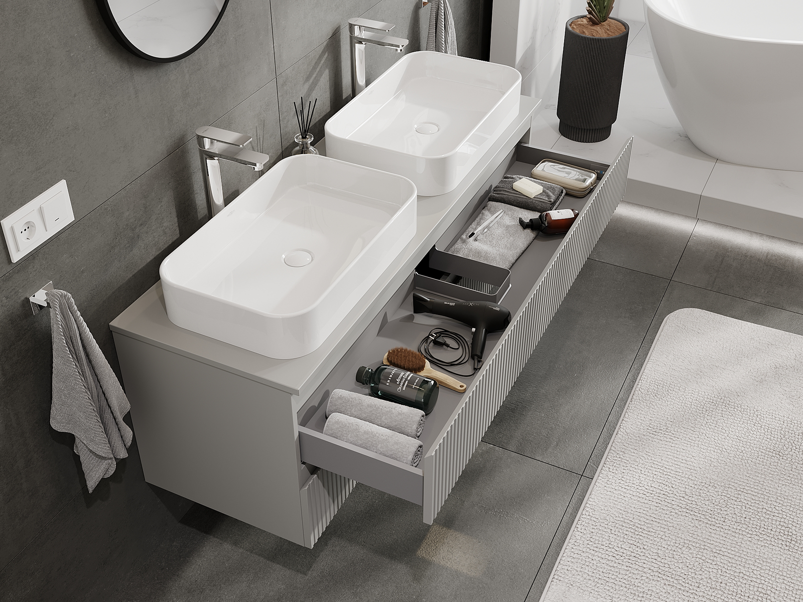 Unsere modularen Badezimmermöbel können in verschiedenen Farbkonfigurationen miteinander kombiniert werden, wodurch eine vollständige Personalisierung ermöglicht wird. Man kann sowohl das Aussehen als auch die Funktionen der einzelnen Elemente auswählen, was es erlaubt, die Möbel an eigene stilistische und funktionale Vorlieben anzupassen.