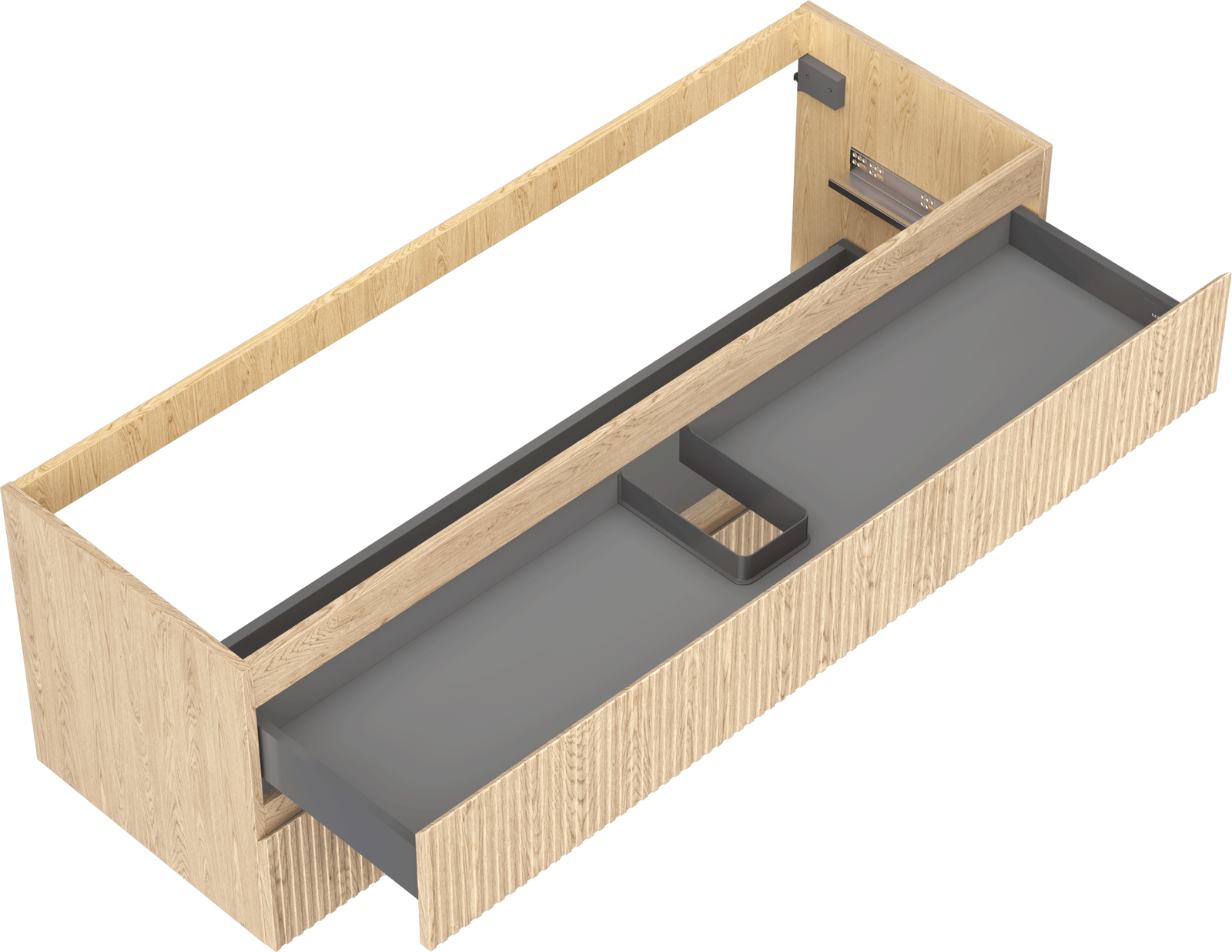 Der Ausschnitt in der Schublade ist für die Aufnahme eines Siphons ausgelegt, der für die Installation von Waschbecken unerlässlich ist. Dadurch kann das Möbelstück voll funktionsfähig installiert werden, ohne dass für die Installation Schubladenplatz geopfert werden muss.