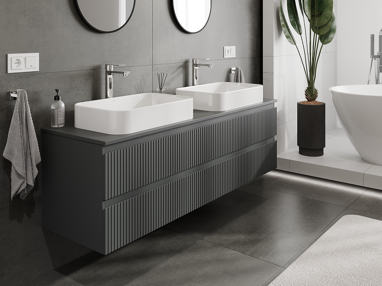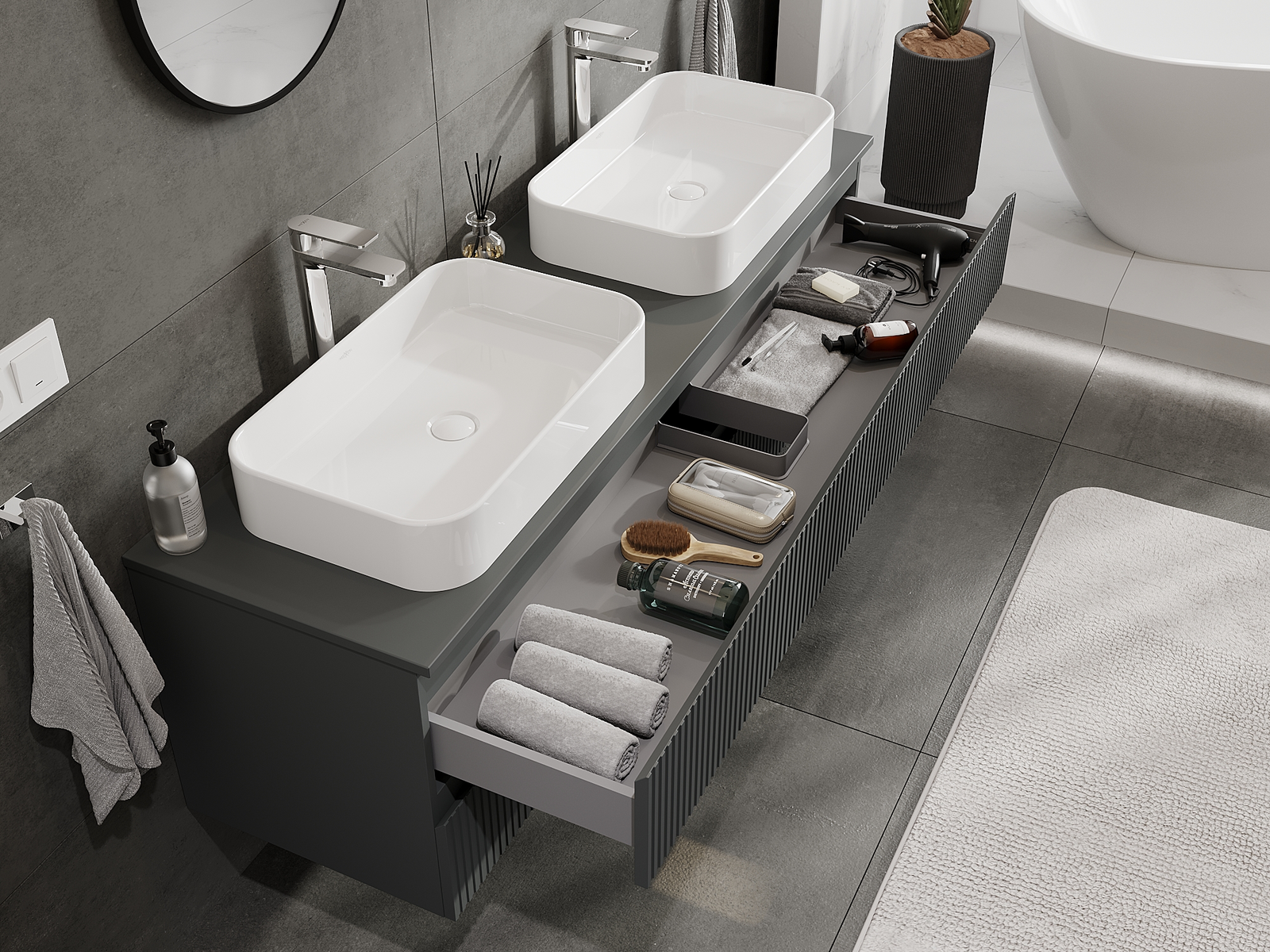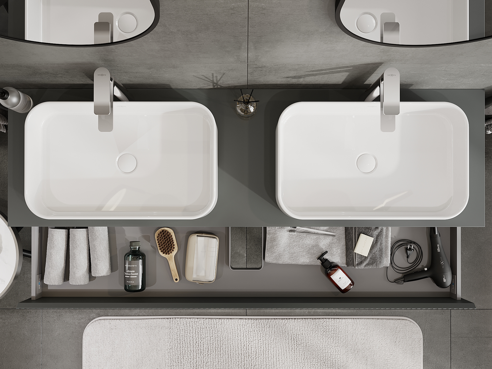 Unsere modularen Badezimmermöbel können in verschiedenen Farbkonfigurationen miteinander kombiniert werden, wodurch eine vollständige Personalisierung ermöglicht wird. Man kann sowohl das Aussehen als auch die Funktionen der einzelnen Elemente auswählen, was es erlaubt, die Möbel an eigene stilistische und funktionale Vorlieben anzupassen.