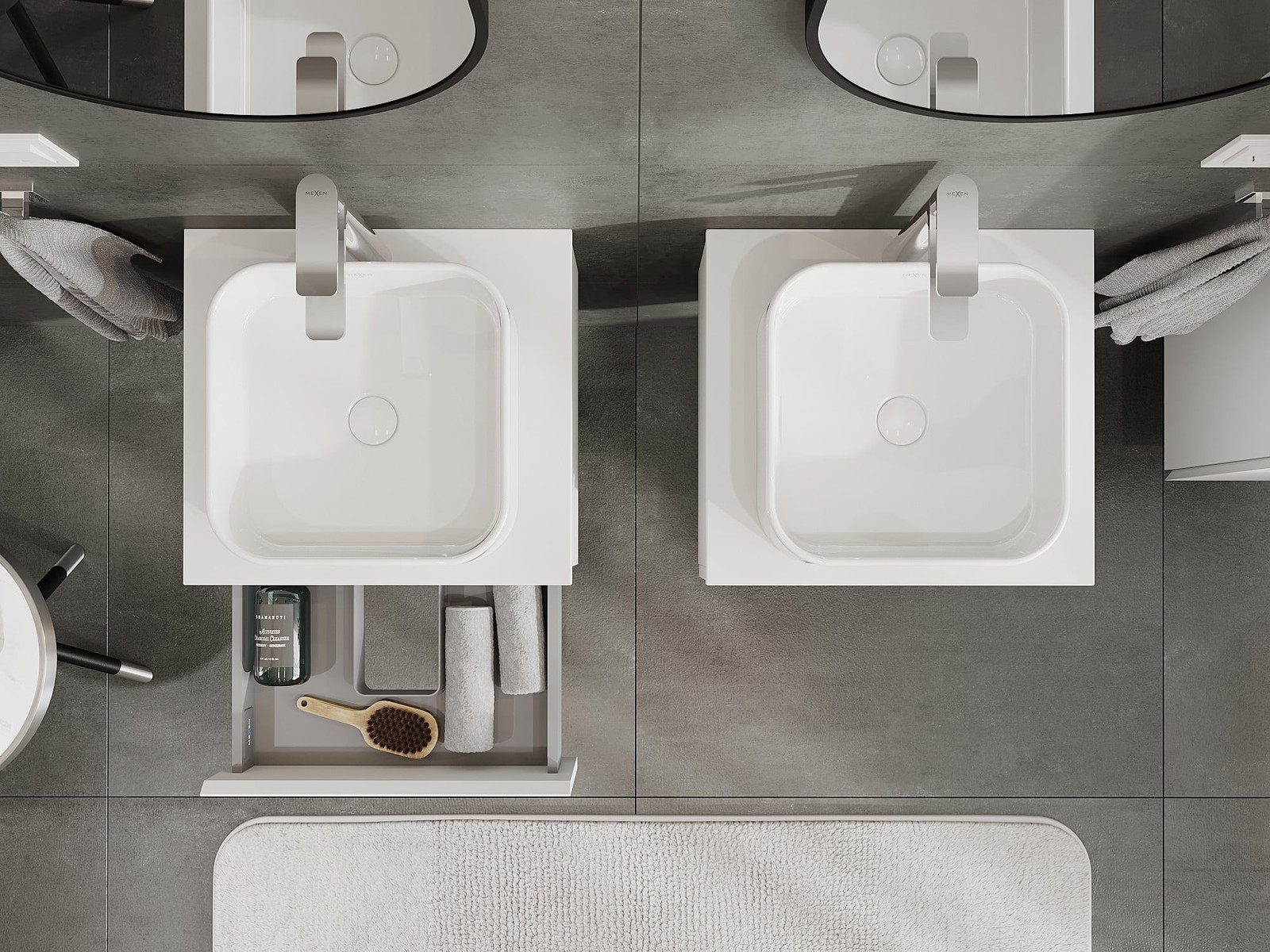 Unsere modularen Badezimmermöbel können in verschiedenen Farbkonfigurationen miteinander kombiniert werden, wodurch eine vollständige Personalisierung ermöglicht wird. Man kann sowohl das Aussehen als auch die Funktionen der einzelnen Elemente auswählen, was es erlaubt, die Möbel an eigene stilistische und funktionale Vorlieben anzupassen.
