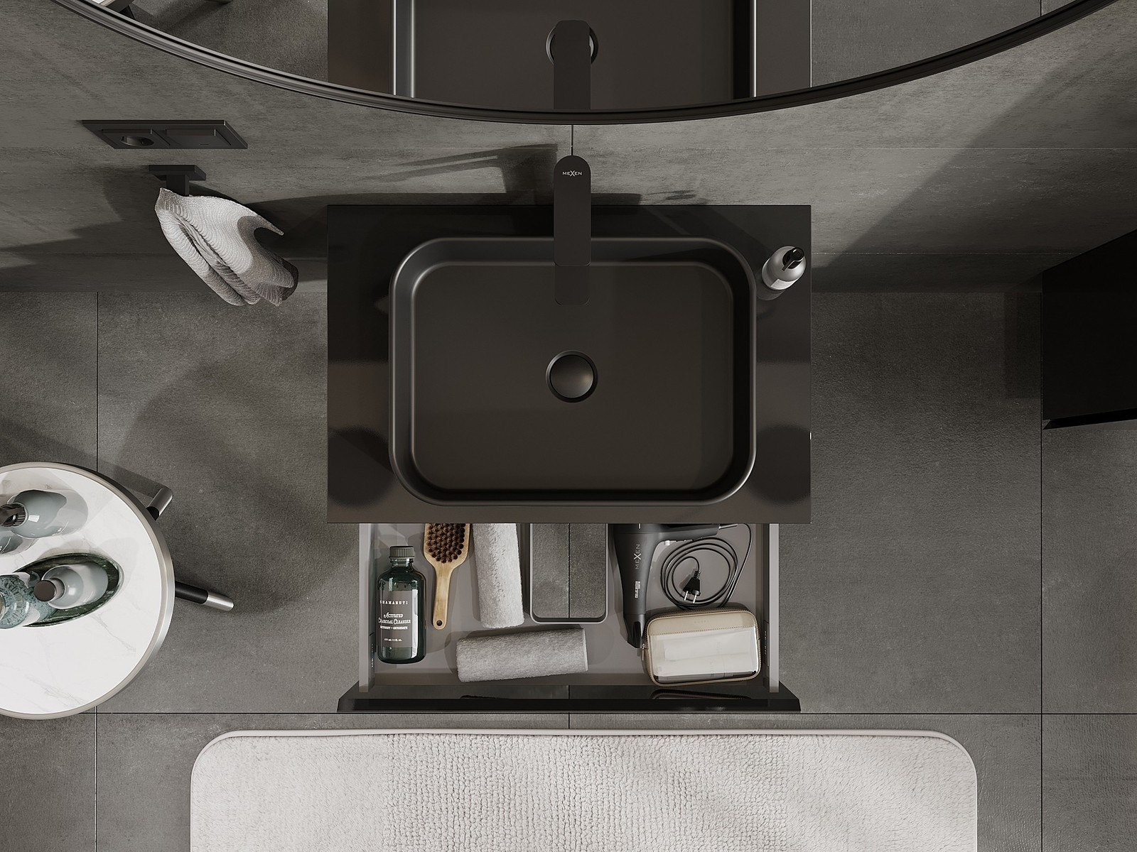 Der Ausschnitt in der Schublade ist so gestaltet, dass er den Siphon aufnehmen kann, der für Waschbeckeninstallationen erforderlich ist. Dadurch kann das Möbelstück voll funktionsfähig montiert werden, ohne auf den Platz in der Schublade zugunsten der Installation verzichten zu müssen.