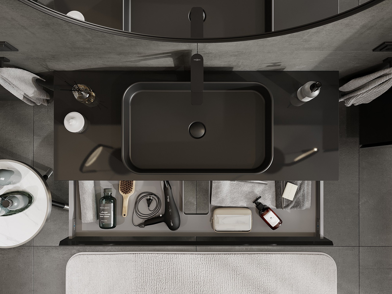 Mexen Orio Badezimmerschrank für Waschbecken 120 cm mit Arbeitsplatte, 1 Schublade, schwarz glänzend - 91A10-12023-1-BFC70