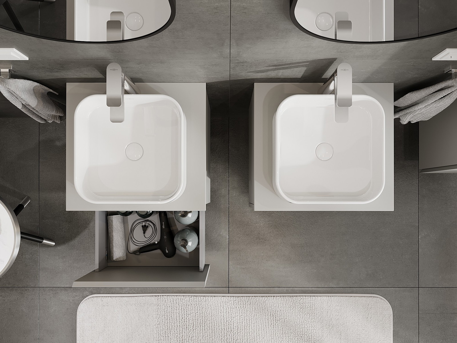 Unsere modularen Badezimmermöbel können in verschiedenen Farbkonfigurationen miteinander kombiniert werden, wodurch eine vollständige Personalisierung ermöglicht wird. Man kann sowohl das Aussehen als auch die Funktionen der einzelnen Elemente auswählen, was es erlaubt, die Möbel an eigene stilistische und funktionale Vorlieben anzupassen.
