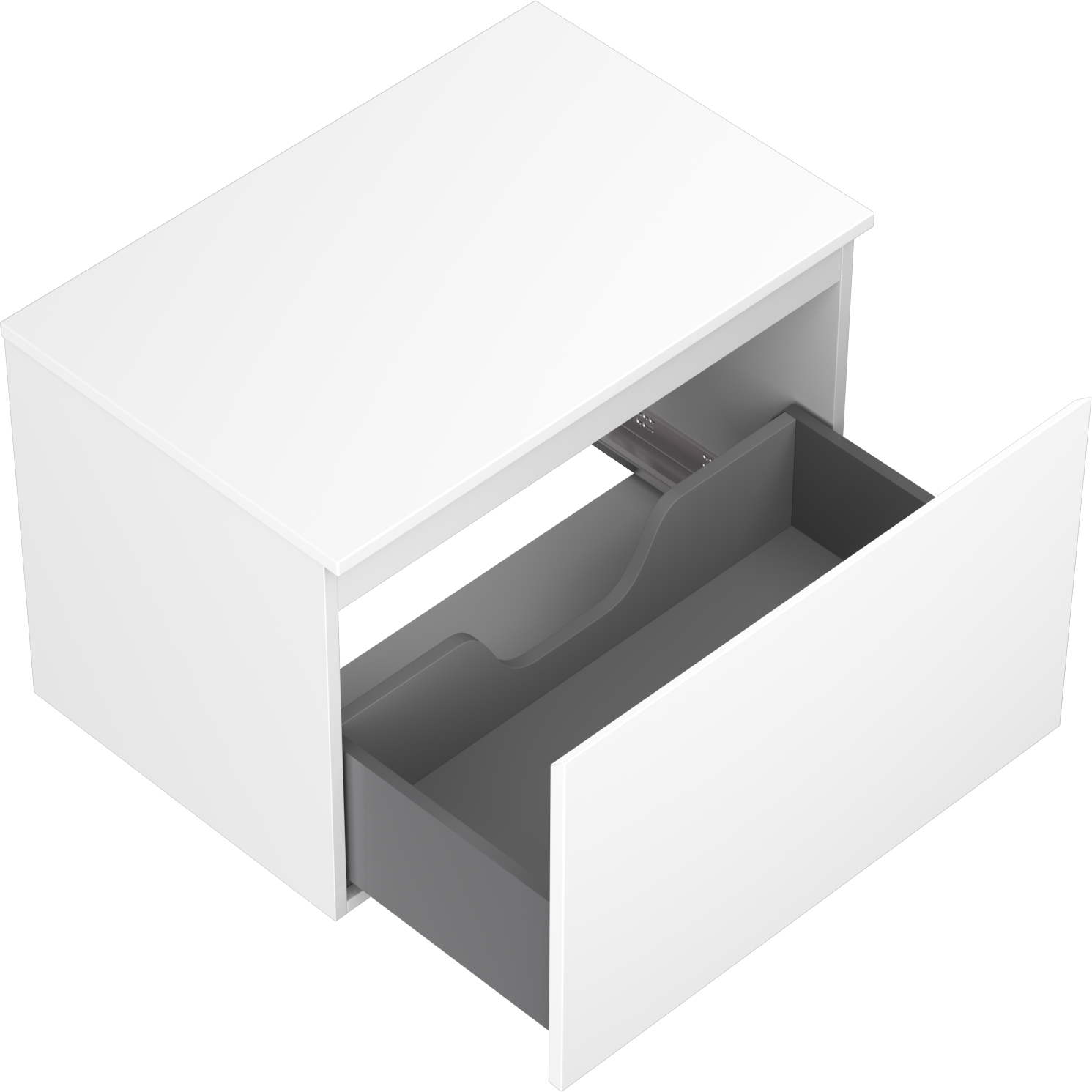 Der Ausschnitt in der Schublade ist so gestaltet, dass er den Siphon aufnehmen kann, der für Waschbeckeninstallationen erforderlich ist. Dadurch kann das Möbelstück voll funktionsfähig montiert werden, ohne auf den Platz in der Schublade zugunsten der Installation verzichten zu müssen.