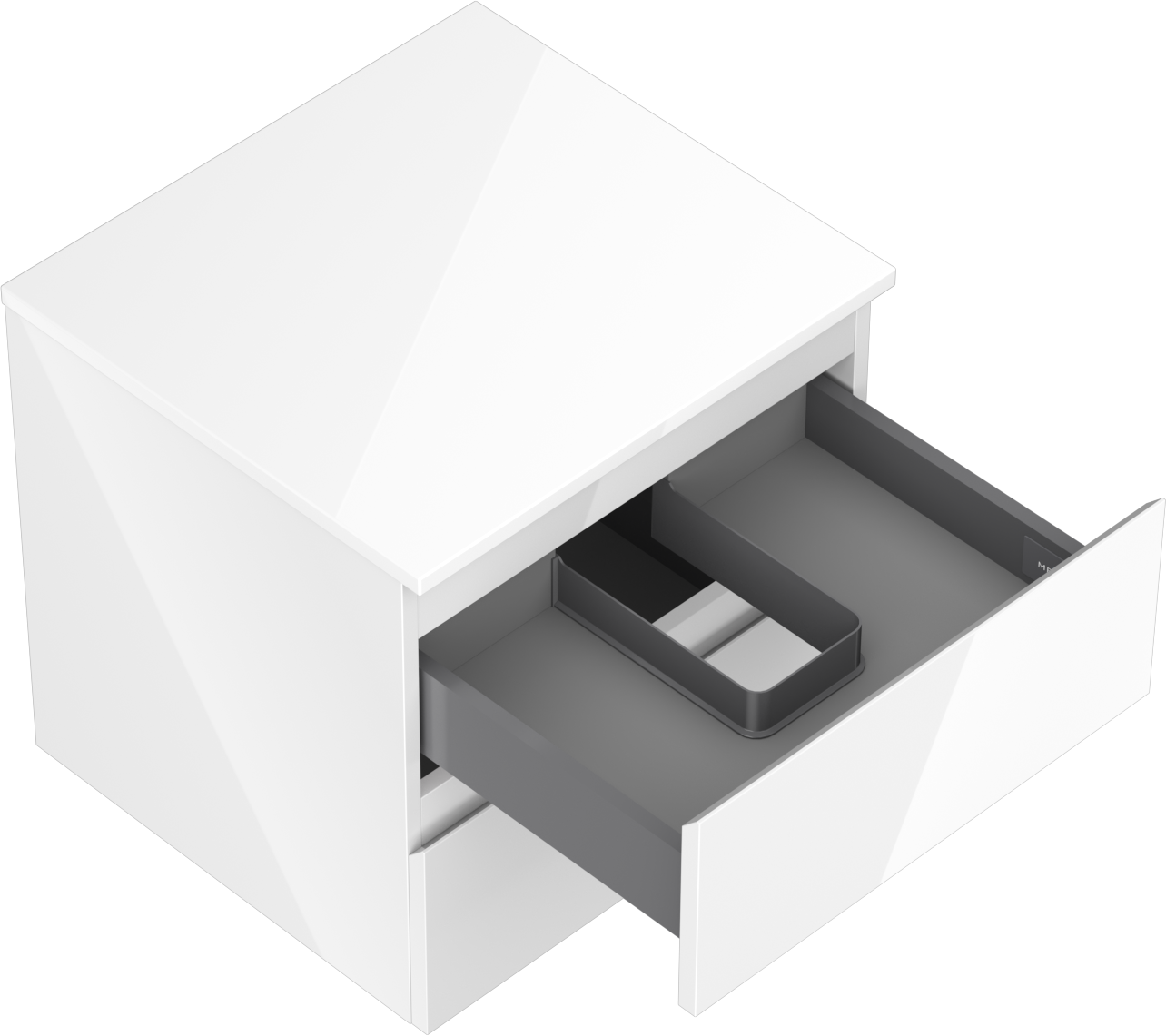 Der Ausschnitt in der Schublade ist so gestaltet, dass er den Siphon aufnehmen kann, der für Waschbeckeninstallationen erforderlich ist. Dadurch kann das Möbelstück voll funktionsfähig montiert werden, ohne auf den Platz in der Schublade zugunsten der Installation verzichten zu müssen.
