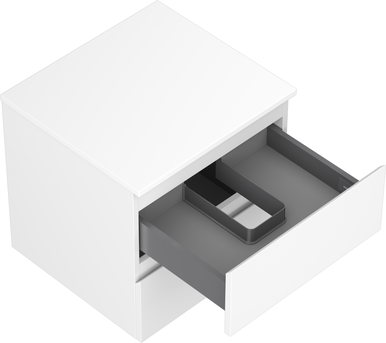 Der Ausschnitt in der Schublade ist so gestaltet, dass er den Siphon aufnehmen kann, der für Waschbeckeninstallationen erforderlich ist. Dadurch kann das Möbelstück voll funktionsfähig montiert werden, ohne auf den Platz in der Schublade zugunsten der Installation verzichten zu müssen.