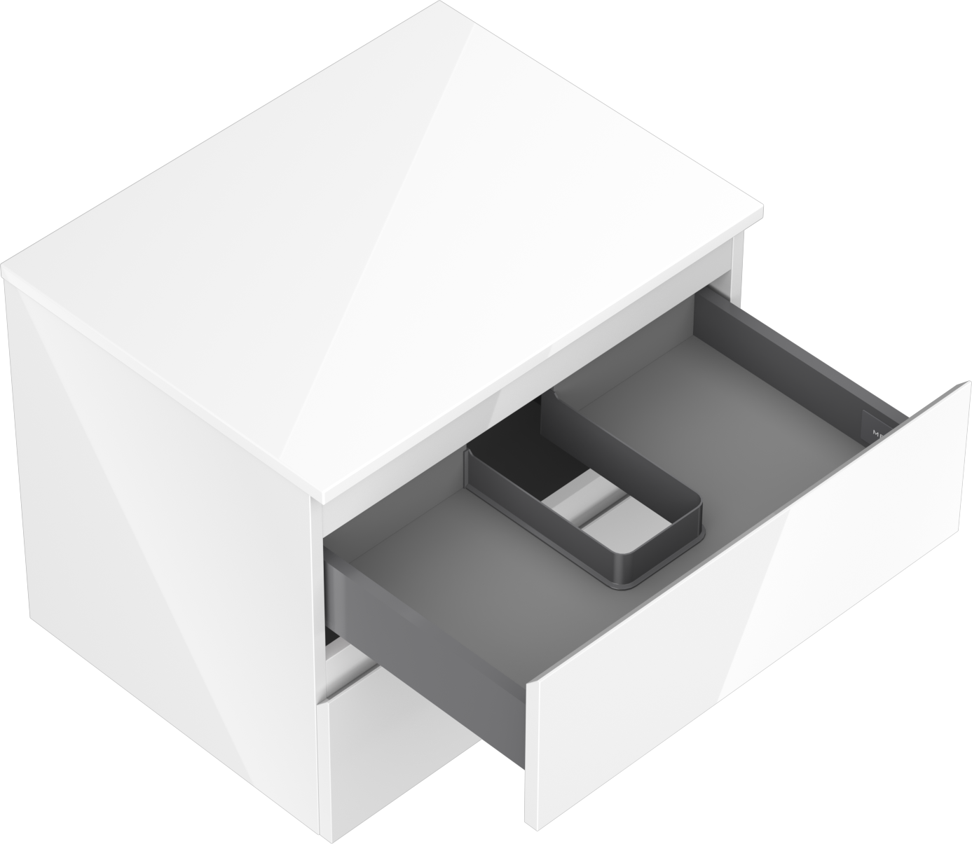 Der Ausschnitt in der Schublade ist so gestaltet, dass er den Siphon aufnehmen kann, der für Waschbeckeninstallationen erforderlich ist. Dadurch kann das Möbelstück voll funktionsfähig montiert werden, ohne auf den Platz in der Schublade zugunsten der Installation verzichten zu müssen.