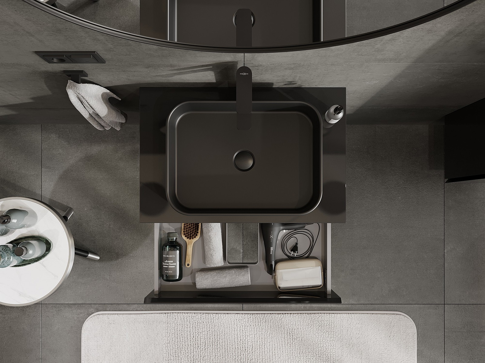 Der Ausschnitt in der Schublade ist so gestaltet, dass er den Siphon aufnehmen kann, der für Waschbeckeninstallationen erforderlich ist. Dadurch kann das Möbelstück voll funktionsfähig montiert werden, ohne auf den Platz in der Schublade zugunsten der Installation verzichten zu müssen.