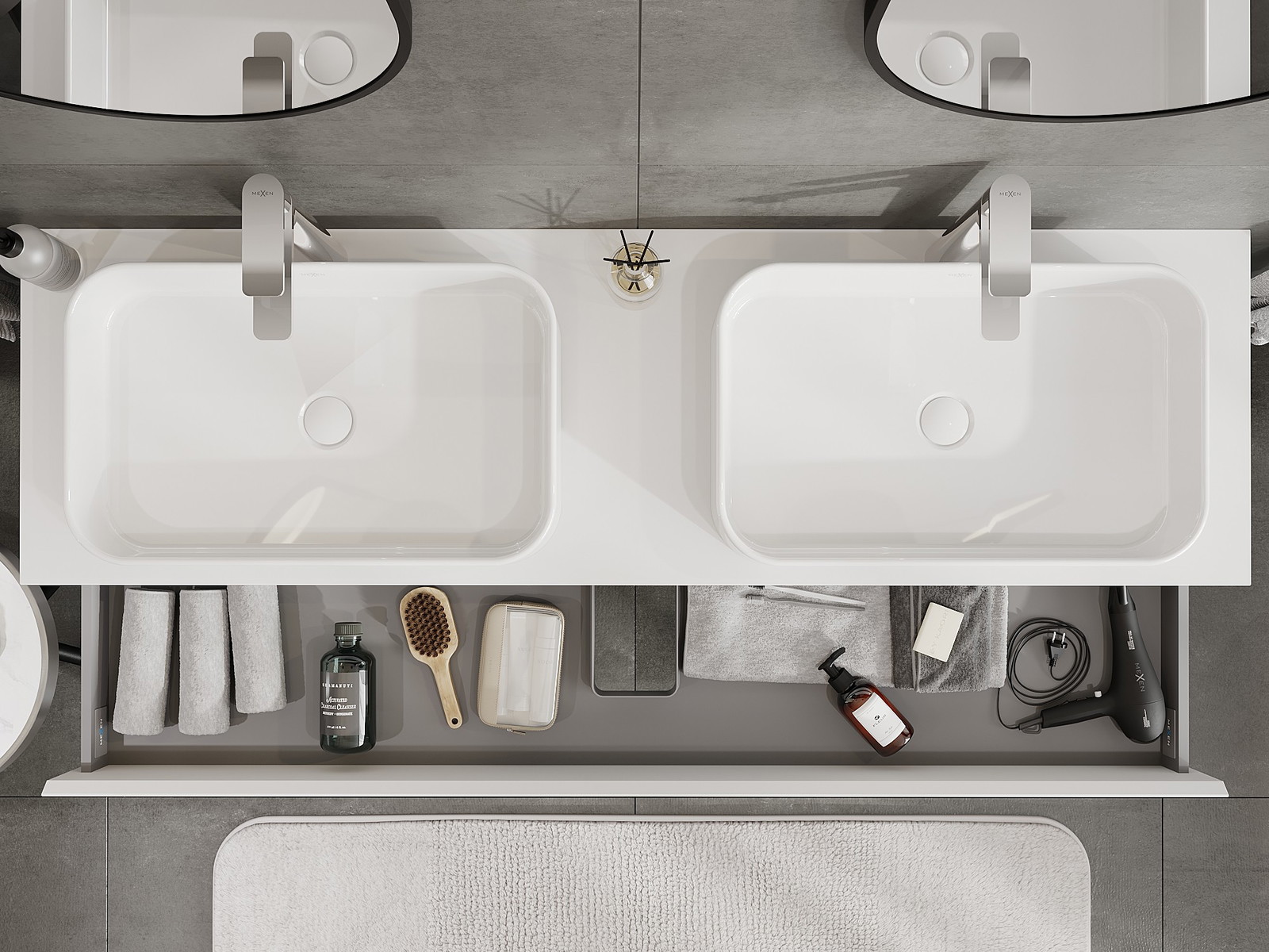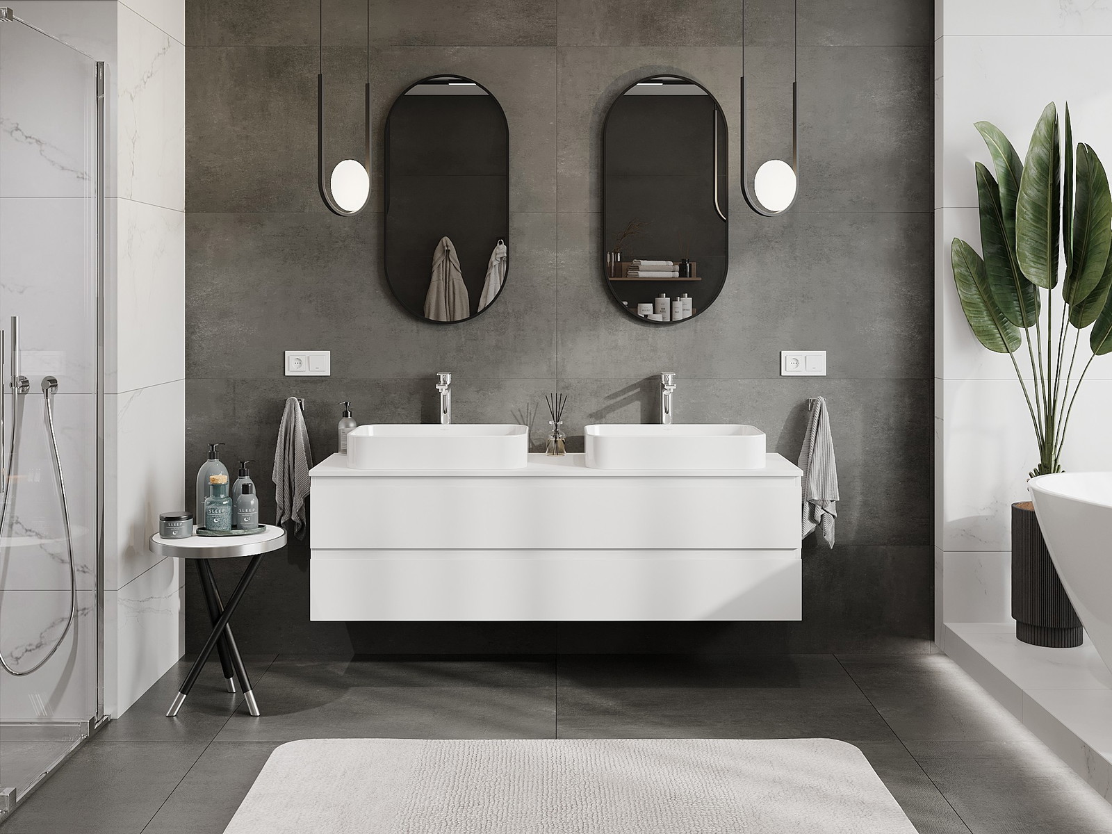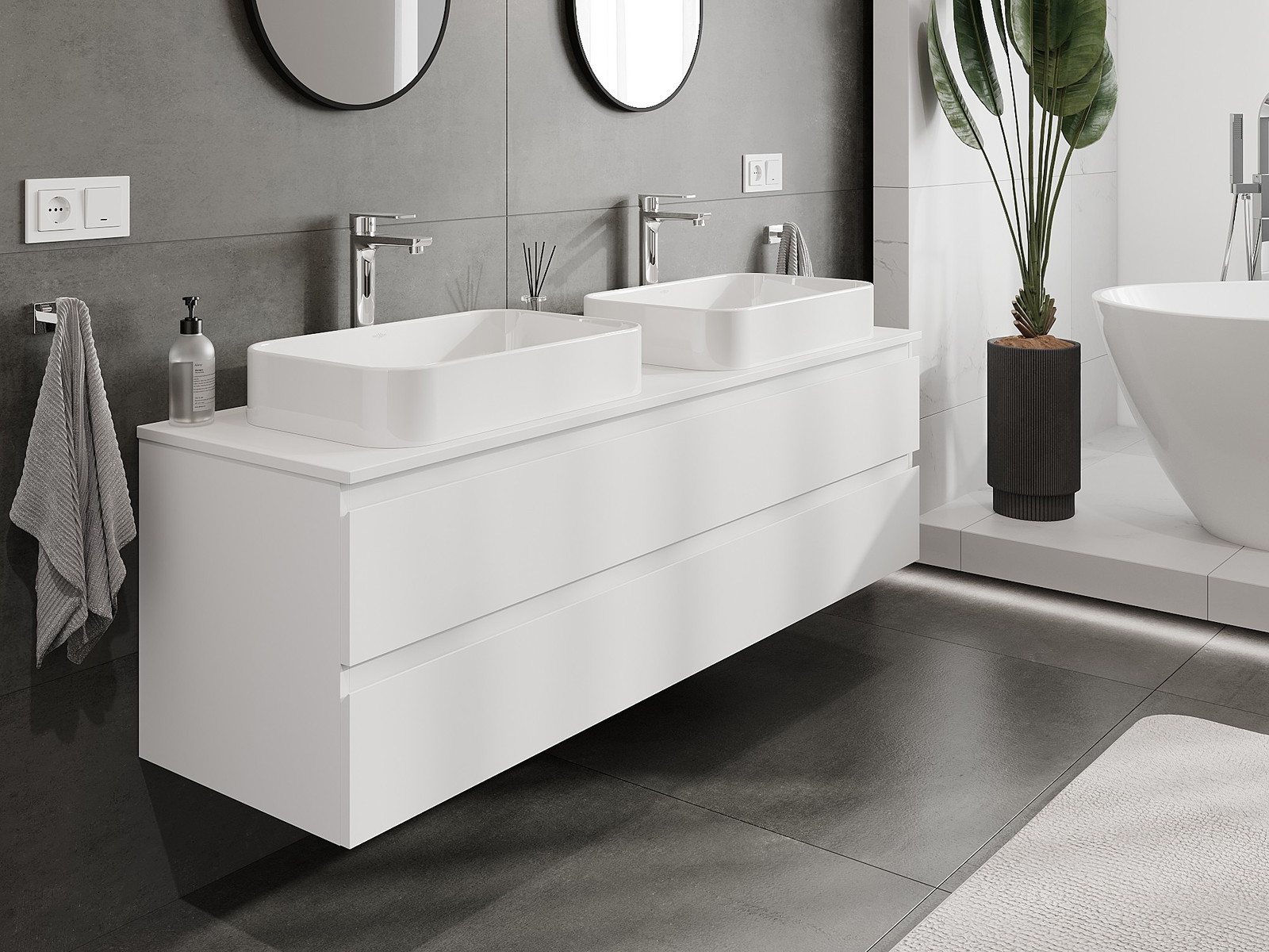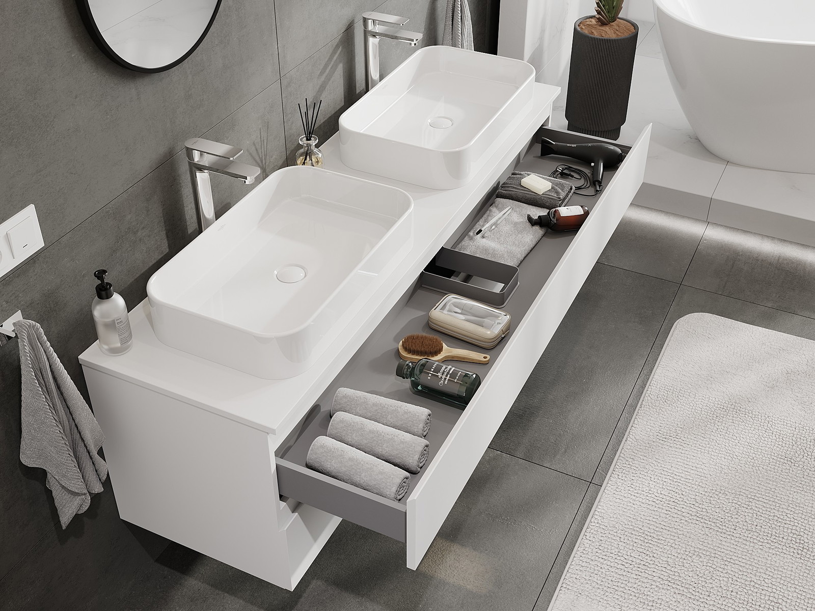 Unsere modularen Badezimmermöbel können in verschiedenen Farbkonfigurationen miteinander kombiniert werden, wodurch eine vollständige Personalisierung ermöglicht wird. Man kann sowohl das Aussehen als auch die Funktionen der einzelnen Elemente auswählen, was es erlaubt, die Möbel an eigene stilistische und funktionale Vorlieben anzupassen.