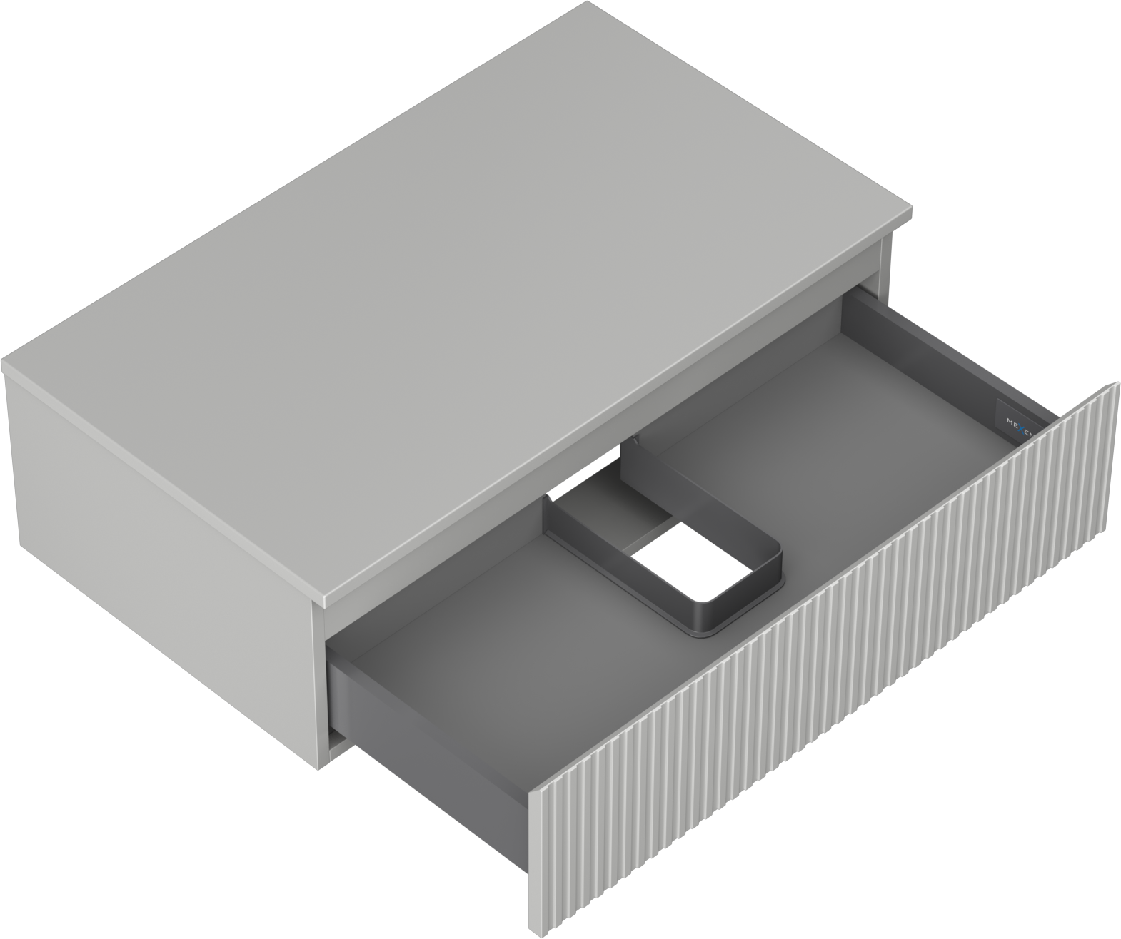 Der Ausschnitt in der Schublade ist so gestaltet, dass er den Siphon aufnehmen kann, der für Waschbeckeninstallationen erforderlich ist. Dadurch kann das Möbelstück voll funktionsfähig montiert werden, ohne auf den Platz in der Schublade zugunsten der Installation verzichten zu müssen.