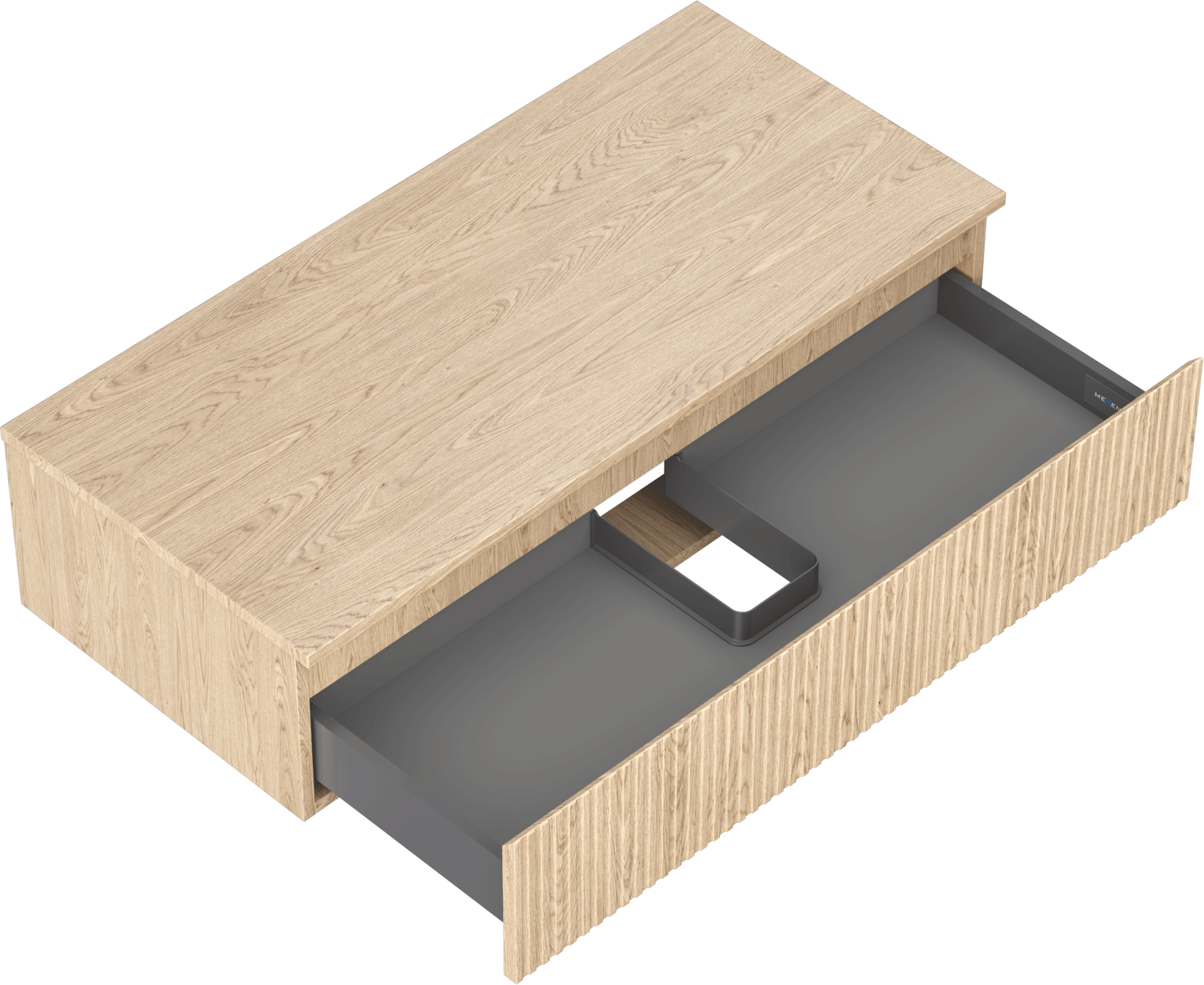 Der Ausschnitt in der Schublade ist für die Aufnahme eines Siphons ausgelegt, der für die Installation von Waschbecken unerlässlich ist. Dadurch kann das Möbelstück voll funktionsfähig installiert werden, ohne dass für die Installation Schubladenplatz geopfert werden muss.