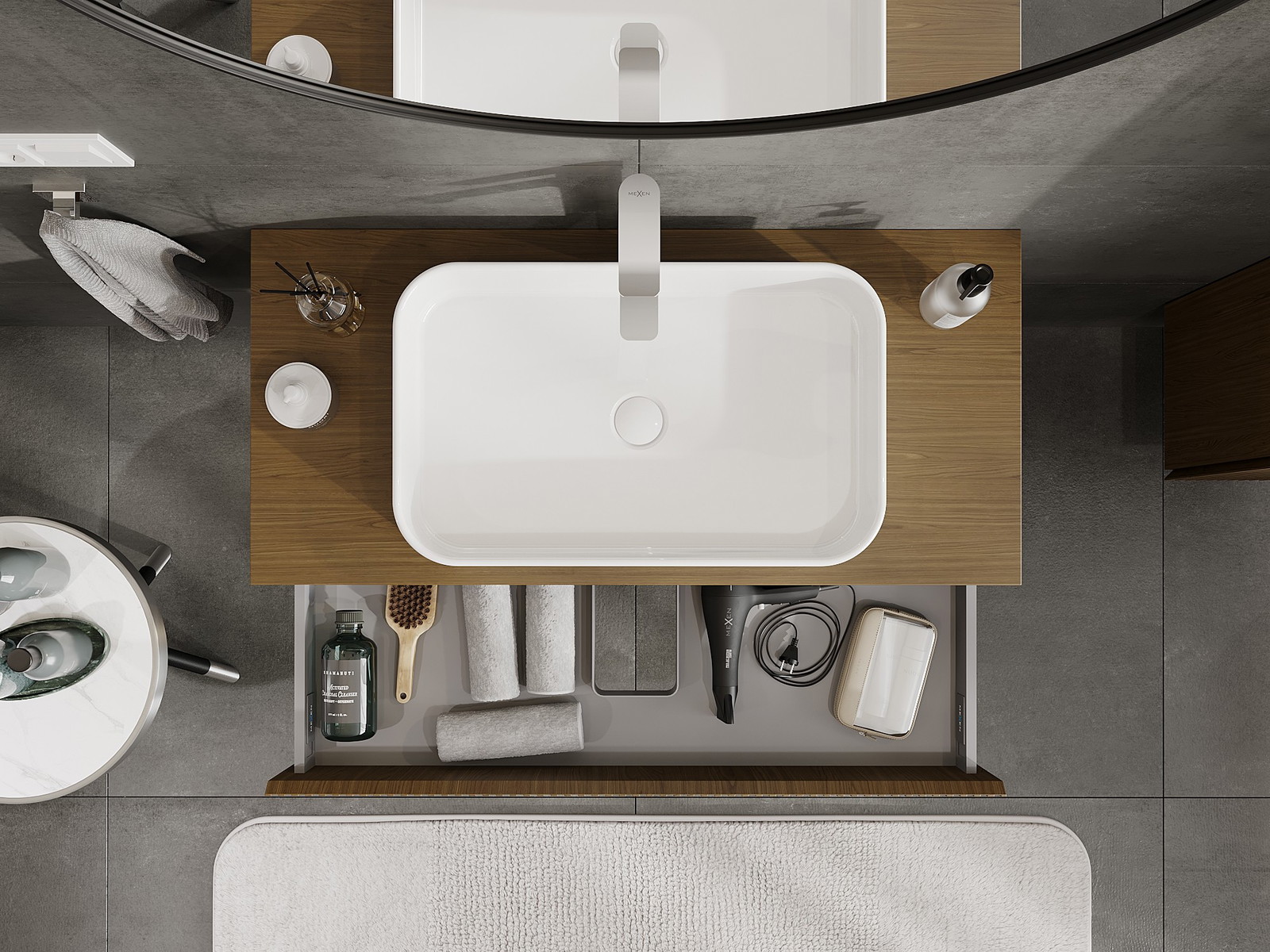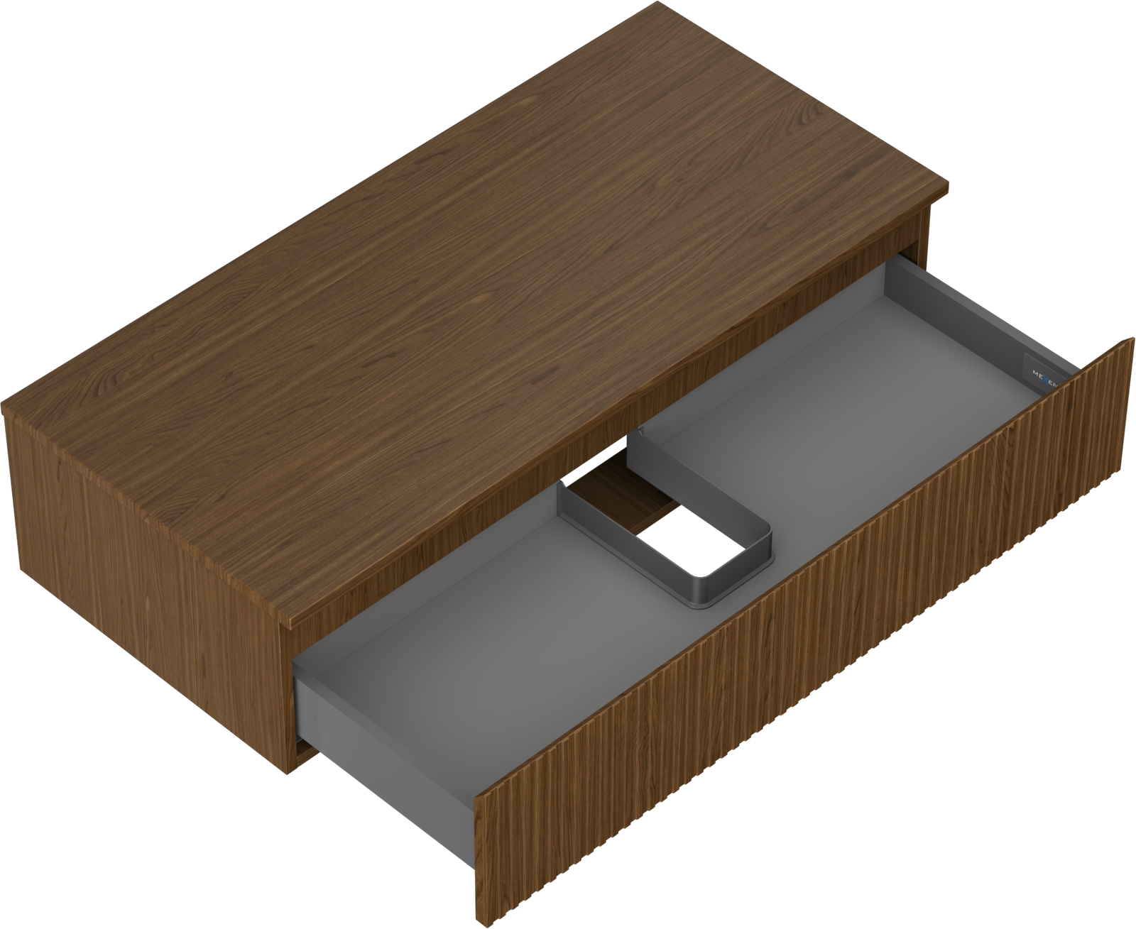 Der Ausschnitt in der Schublade ist so gestaltet, dass er den Siphon aufnehmen kann, der für Waschbeckeninstallationen erforderlich ist. Dadurch kann das Möbelstück voll funktionsfähig montiert werden, ohne auf den Platz in der Schublade zugunsten der Installation verzichten zu müssen.