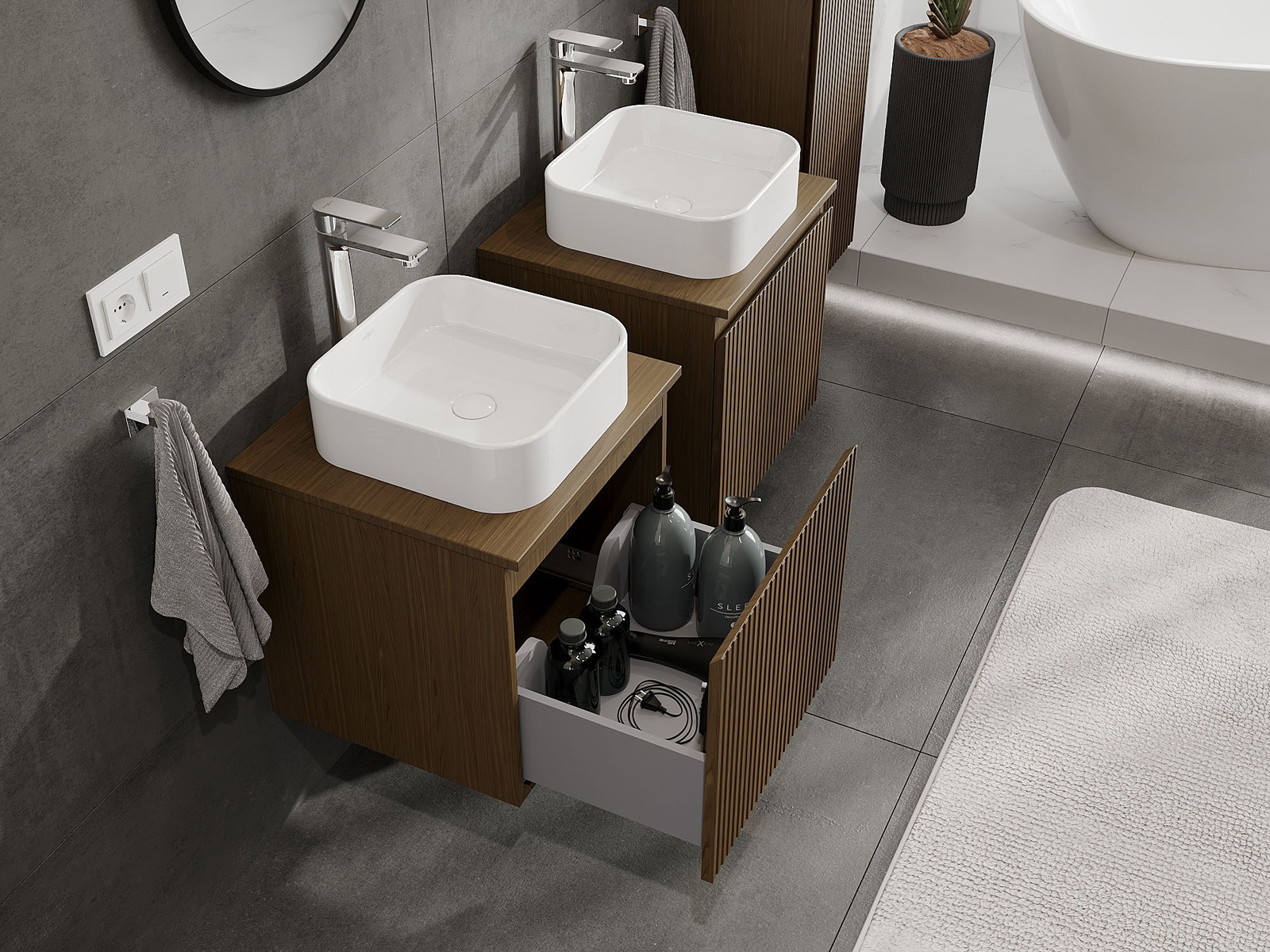 Unsere modularen Badezimmermöbel können in verschiedenen Farbkonfigurationen miteinander kombiniert werden, wodurch eine vollständige Personalisierung ermöglicht wird. Man kann sowohl das Aussehen als auch die Funktionen der einzelnen Elemente auswählen, was es erlaubt, die Möbel an eigene stilistische und funktionale Vorlieben anzupassen.