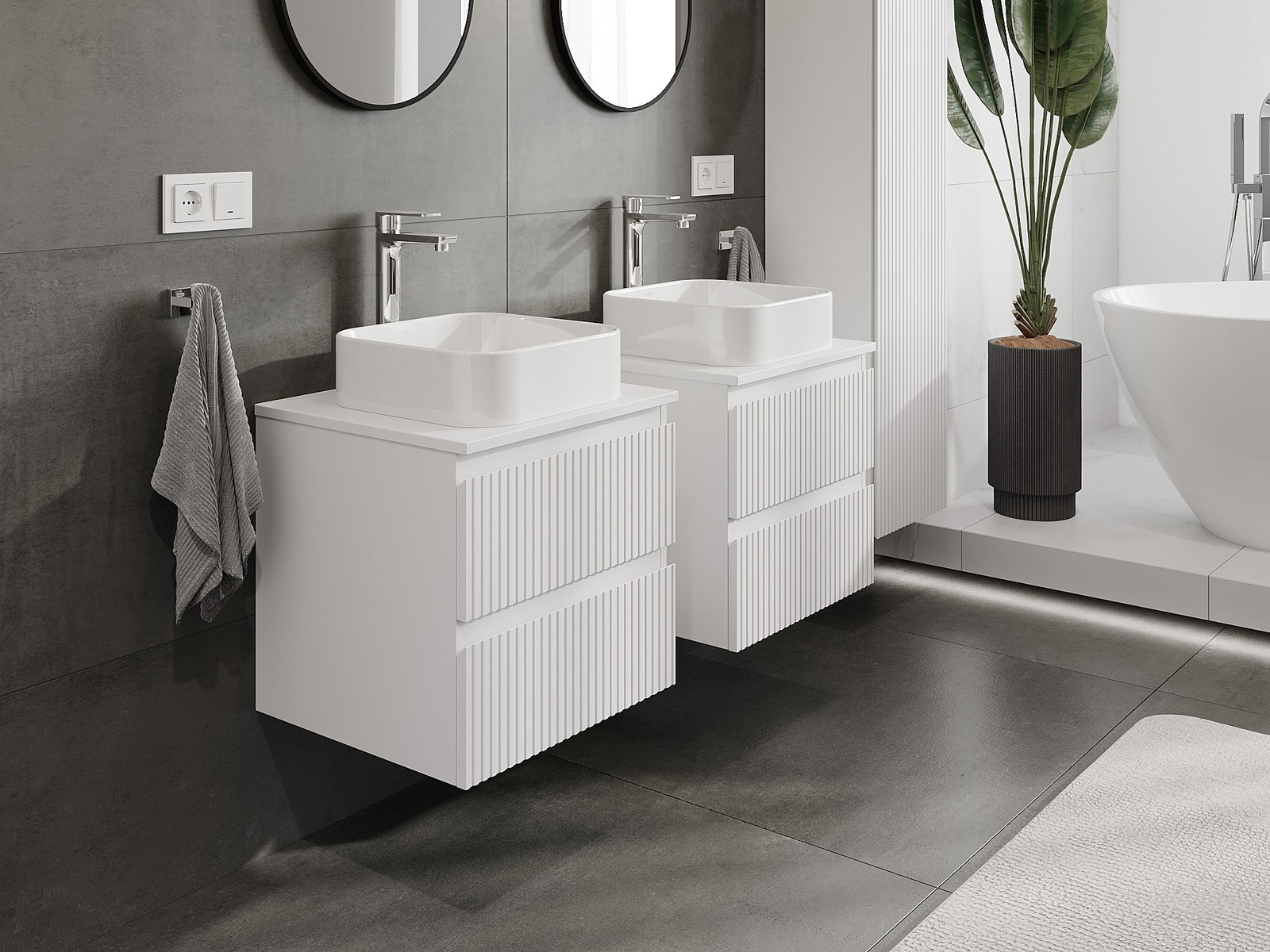 Unsere modularen Badezimmermöbel können in verschiedenen Farbkonfigurationen miteinander kombiniert werden, wodurch eine vollständige Personalisierung ermöglicht wird. Man kann sowohl das Aussehen als auch die Funktionen der einzelnen Elemente auswählen, was es erlaubt, die Möbel an eigene stilistische und funktionale Vorlieben anzupassen.