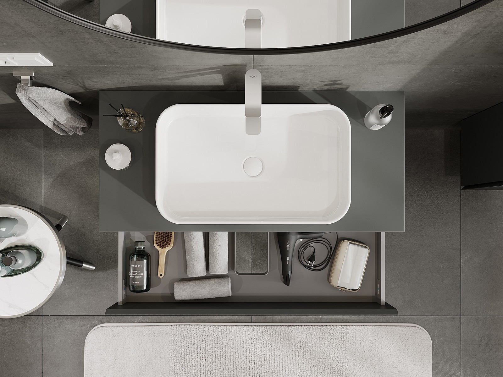 Der Ausschnitt in der Schublade ist so gestaltet, dass er den Siphon aufnehmen kann, der für Waschbeckeninstallationen erforderlich ist. Dadurch kann das Möbelstück voll funktionsfähig montiert werden, ohne auf den Platz in der Schublade zugunsten der Installation verzichten zu müssen.