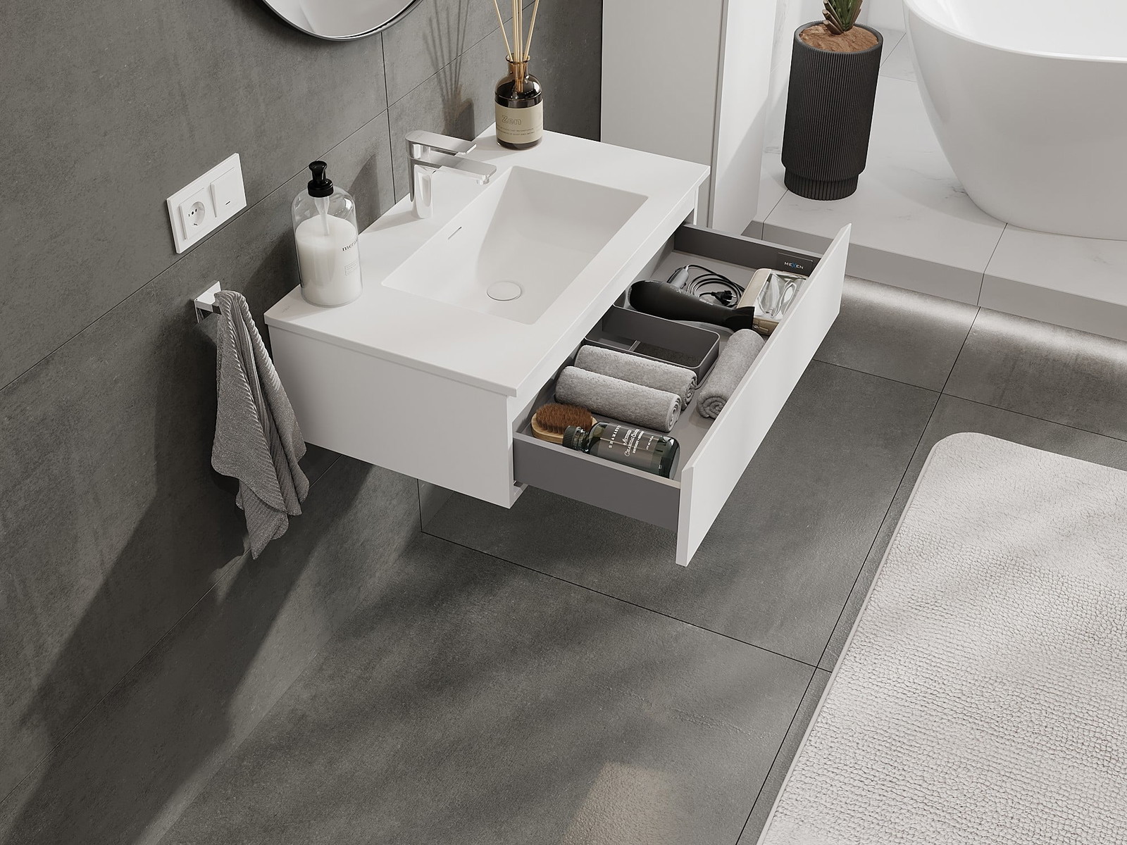 Das Waschbecken verfügt über eine Öffnung, in der wir eine Armatur montieren können. Dies spart wertvollen Platz im Badezimmer und unterstreicht dessen Ästhetik. Diese Lösung ermöglicht auch eine einfachere Reinigung rund um das Waschbecken.