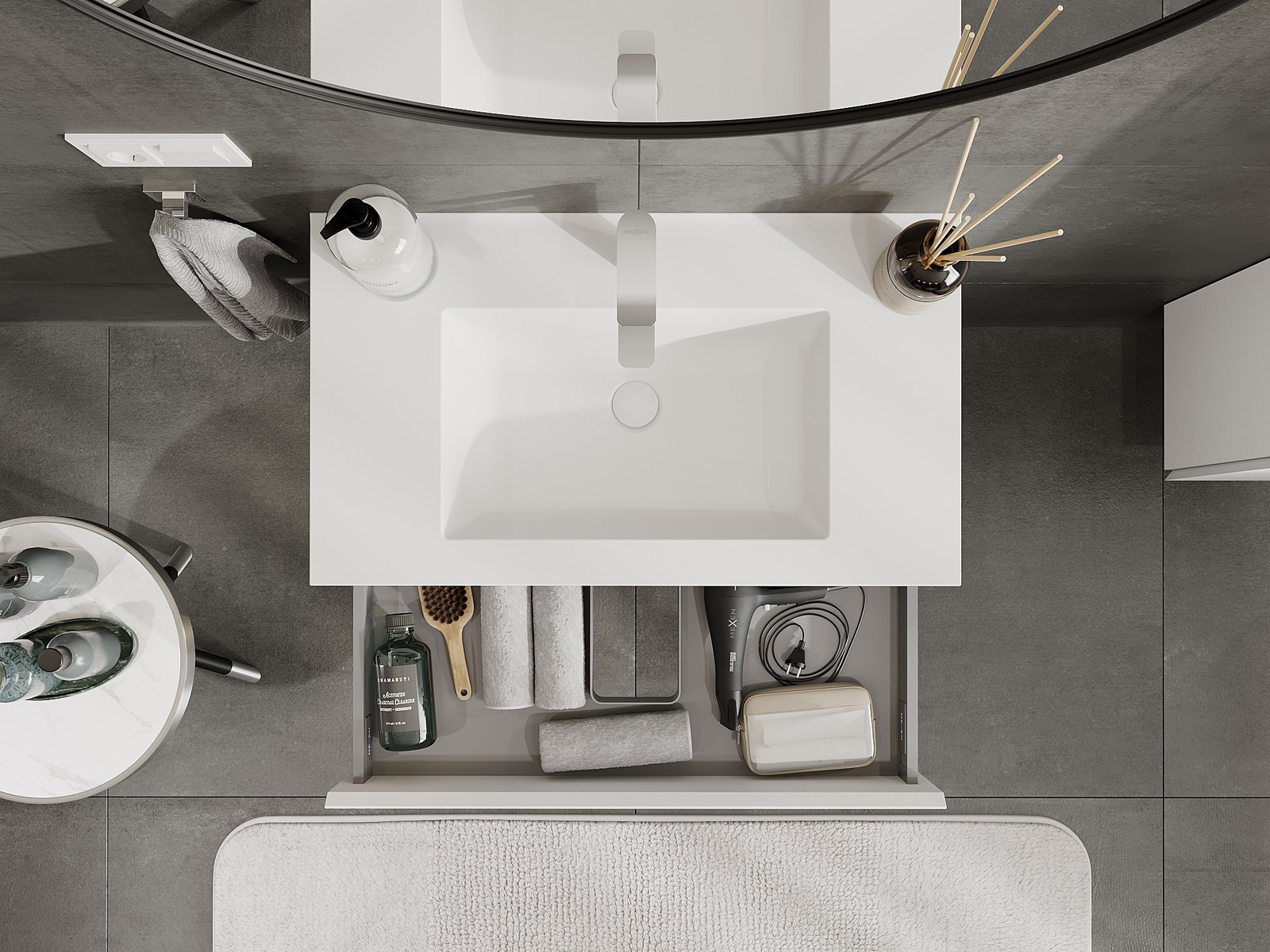 Der Ausschnitt in der Schublade ist so gestaltet, dass er den Siphon aufnehmen kann, der für Waschbeckeninstallationen erforderlich ist. Dadurch kann das Möbelstück voll funktionsfähig montiert werden, ohne auf den Platz in der Schublade zugunsten der Installation verzichten zu müssen.