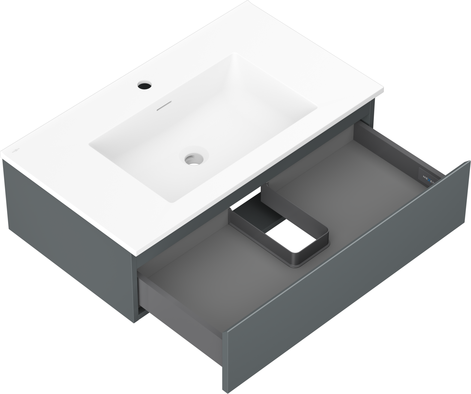 Der Ausschnitt in der Schublade ist so gestaltet, dass er den Siphon aufnehmen kann, der für Waschbeckeninstallationen erforderlich ist. Dadurch kann das Möbelstück voll funktionsfähig montiert werden, ohne auf den Platz in der Schublade zugunsten der Installation verzichten zu müssen.