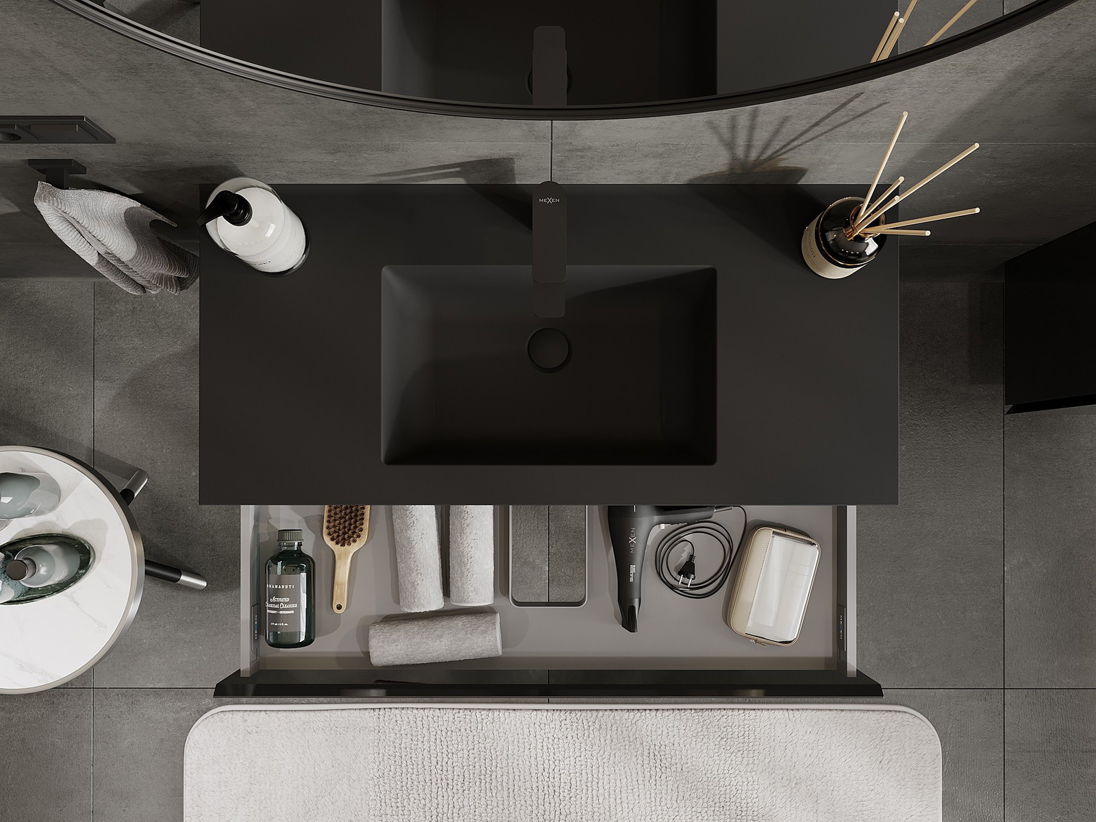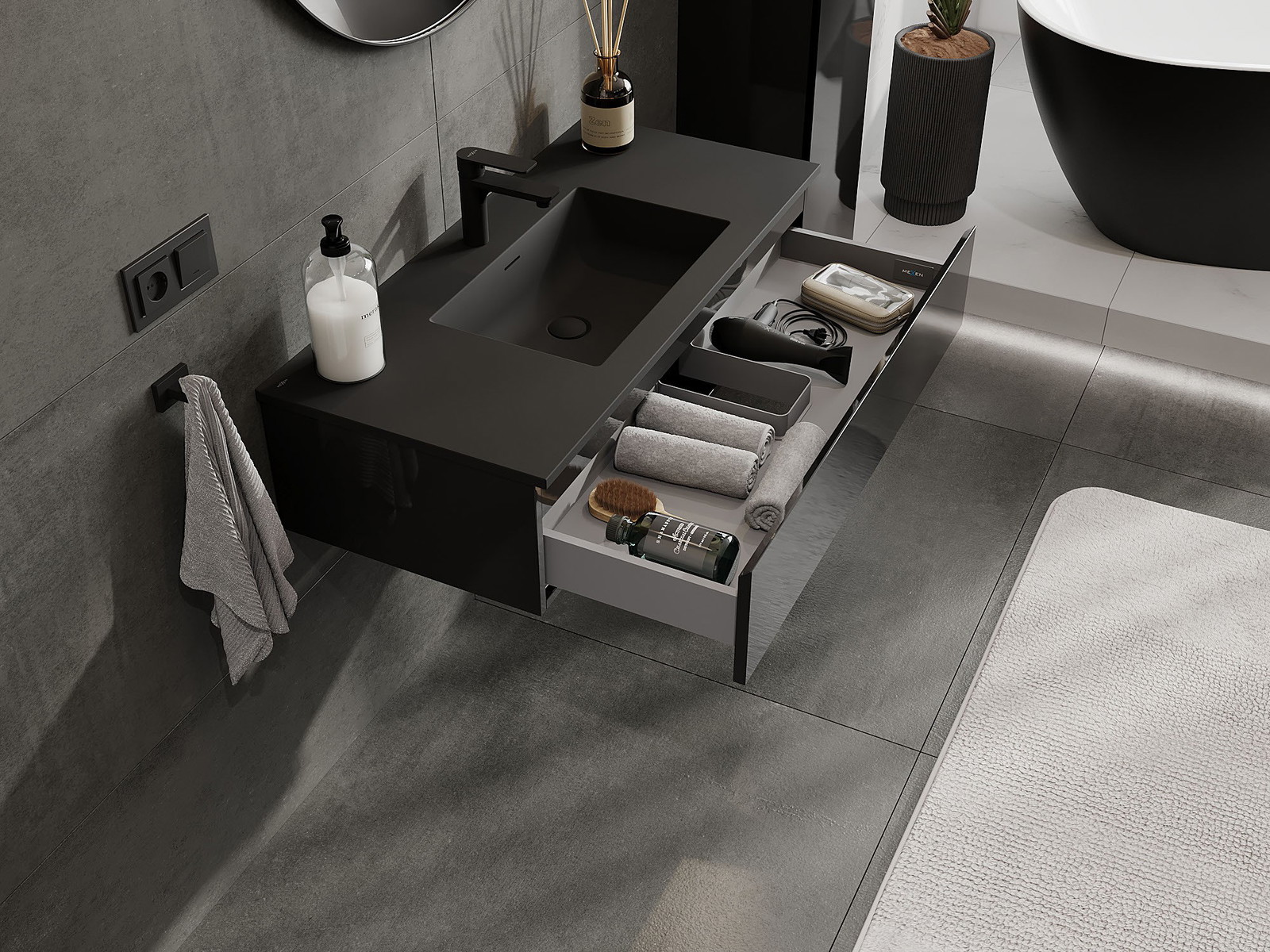 Mexen Orio Badezimmerschrank 100 cm mit Waschbecken Otis, 1 Schublade, Schwarz Glanz/Schwarz Matt - 91A10-10023-1-BF70-W18M71