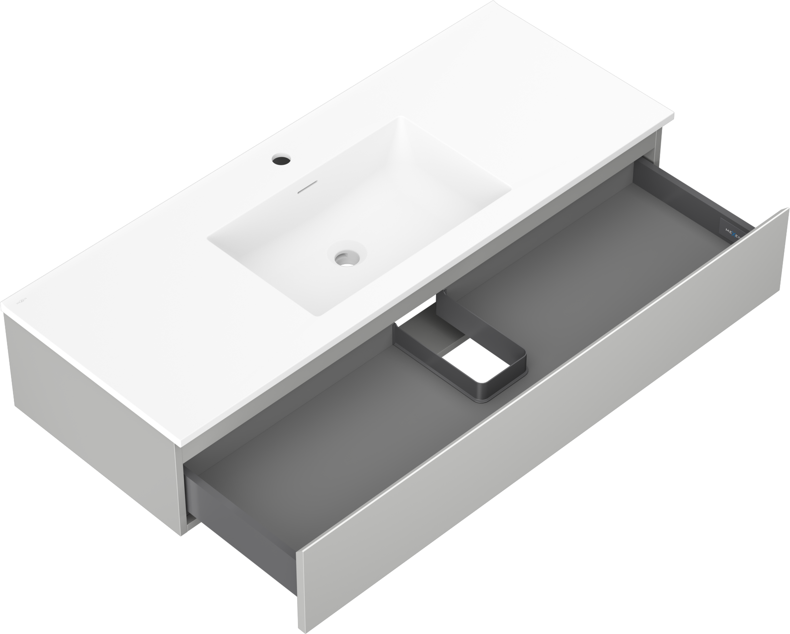 Der Ausschnitt in der Schublade ist so gestaltet, dass er den Siphon aufnehmen kann, der für Waschbeckeninstallationen erforderlich ist. Dadurch kann das Möbelstück voll funktionsfähig montiert werden, ohne auf den Platz in der Schublade zugunsten der Installation verzichten zu müssen.