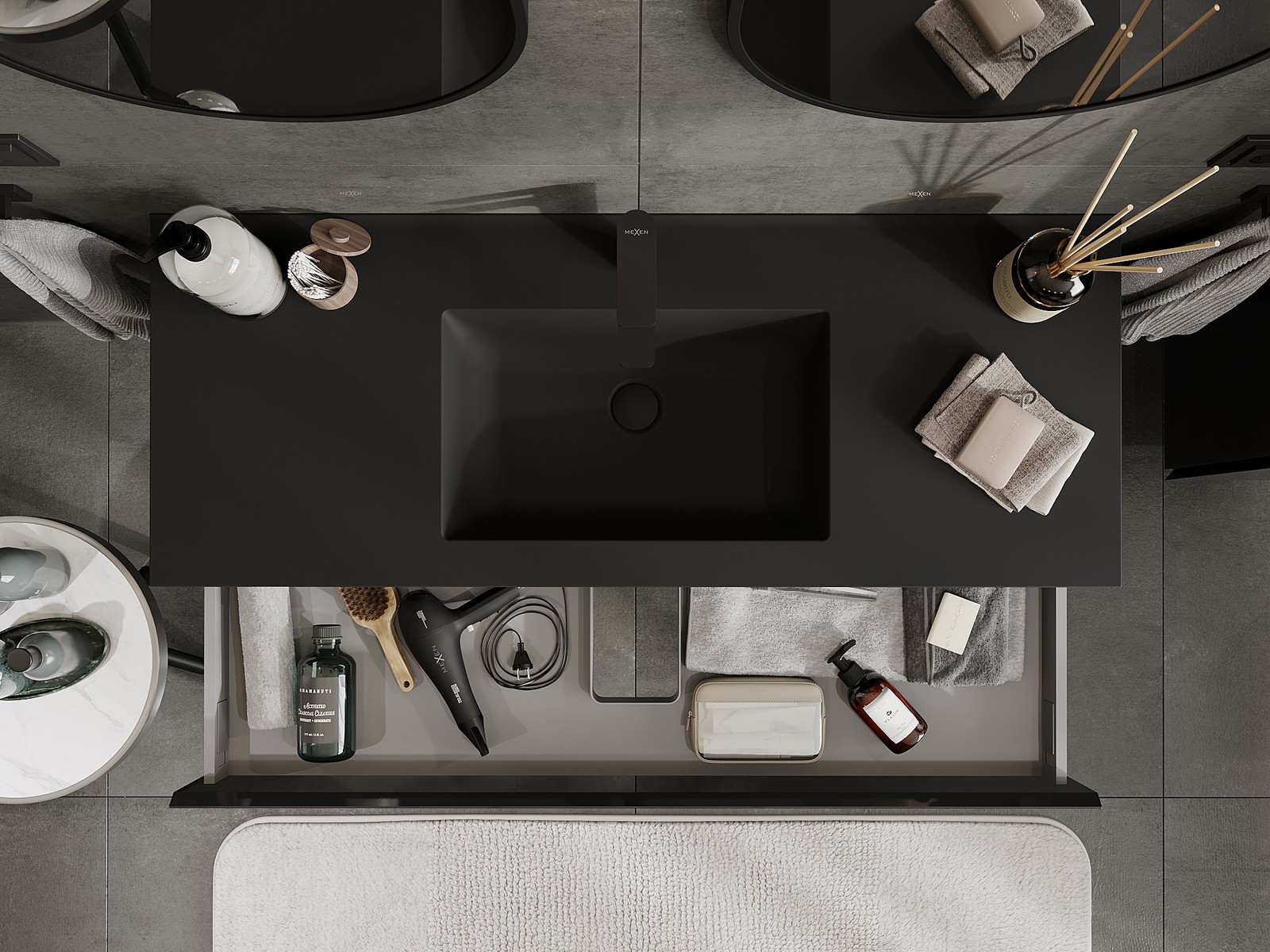 Mexen Orio Badezimmerschrank 120 cm mit Waschbecken Otis, 1 Schublade, Schwarz Glanz/Schwarz Matt - 91A10-12023-1-BF70-W18M71