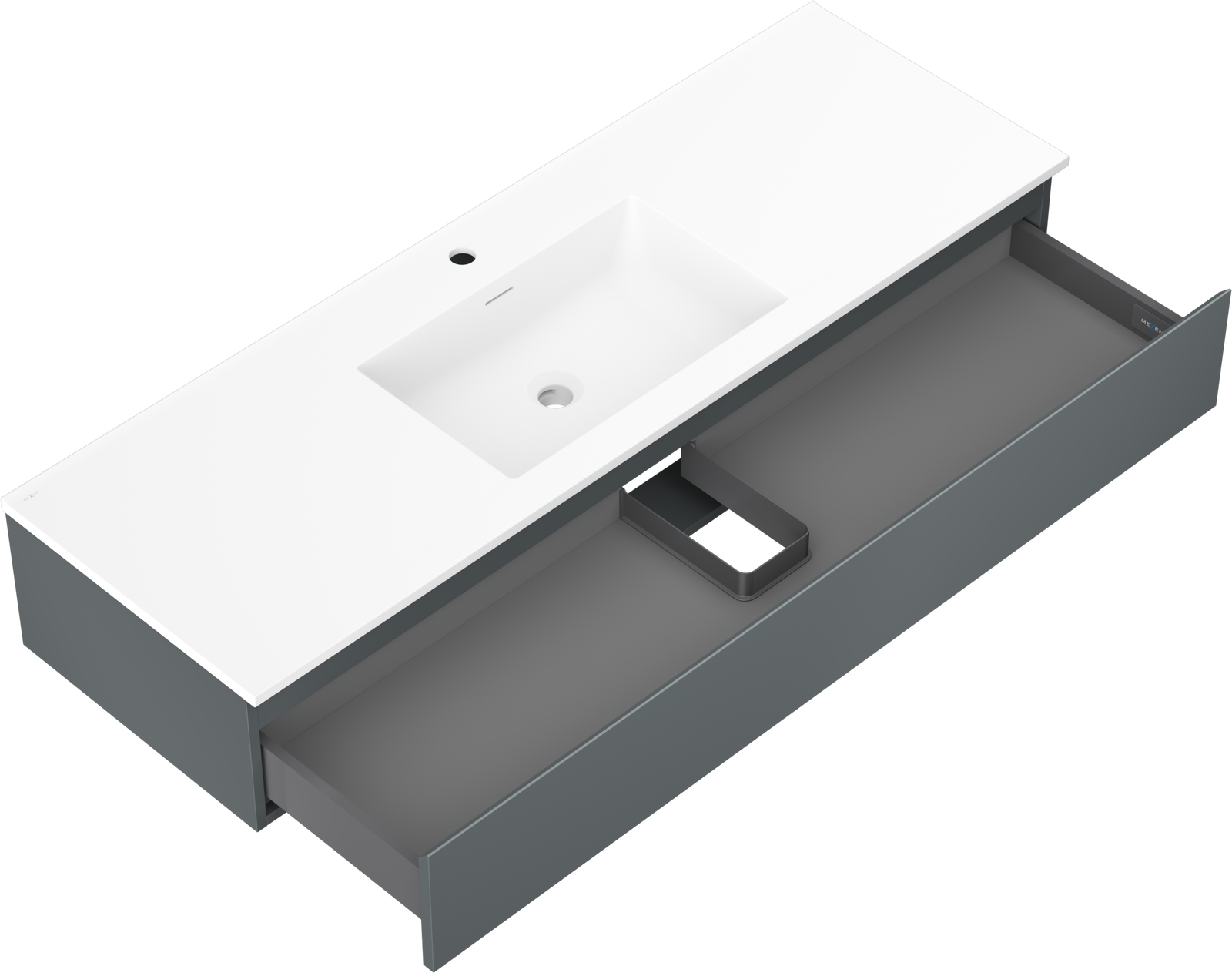 Der Ausschnitt in der Schublade ist so gestaltet, dass er den Siphon aufnehmen kann, der für Waschbeckeninstallationen erforderlich ist. Dadurch kann das Möbelstück voll funktionsfähig montiert werden, ohne auf den Platz in der Schublade zugunsten der Installation verzichten zu müssen.