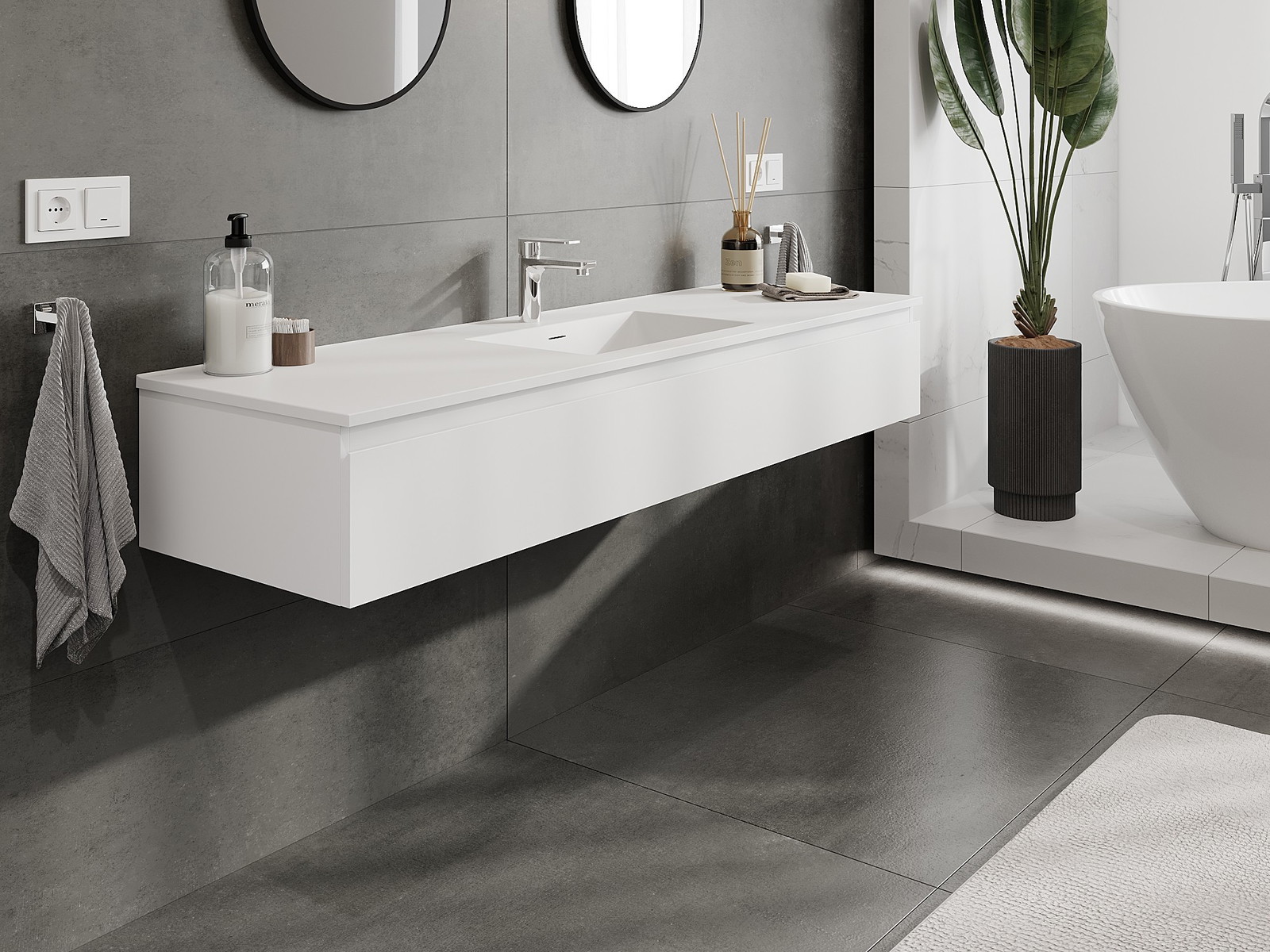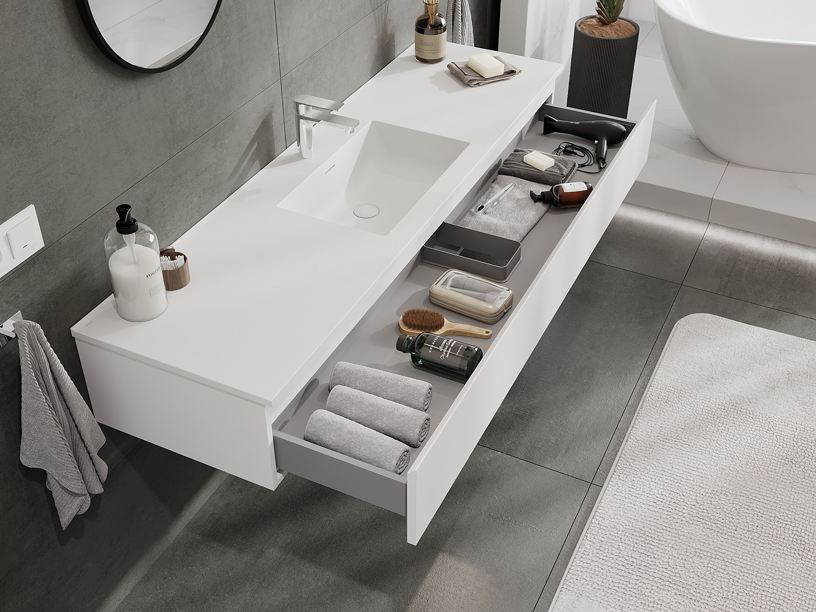 Unsere modularen Badezimmermöbel können in verschiedenen Farbkonfigurationen miteinander kombiniert werden, wodurch eine vollständige Personalisierung ermöglicht wird. Man kann sowohl das Aussehen als auch die Funktionen der einzelnen Elemente auswählen, was es erlaubt, die Möbel an eigene stilistische und funktionale Vorlieben anzupassen.