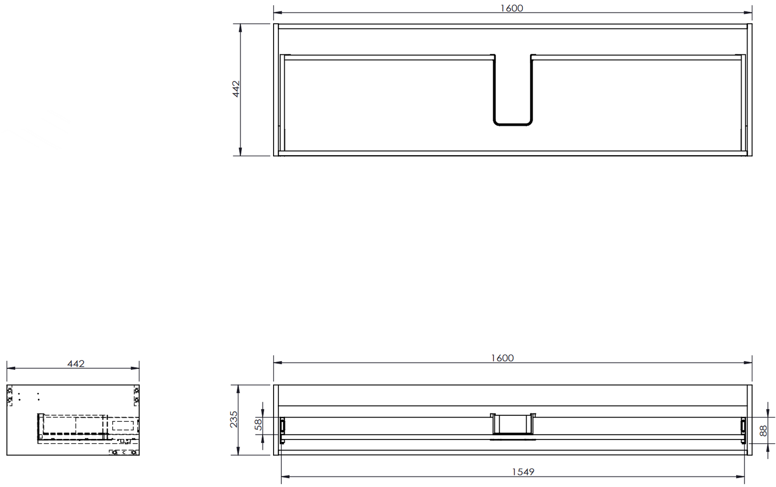 Der Ausschnitt in der Schublade ist so gestaltet, dass er den Siphon aufnehmen kann, der für Waschbeckeninstallationen erforderlich ist. Dadurch kann das Möbelstück voll funktionsfähig montiert werden, ohne auf den Platz in der Schublade zugunsten der Installation verzichten zu müssen.