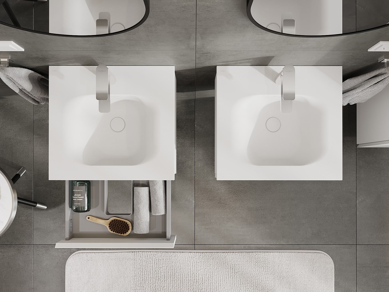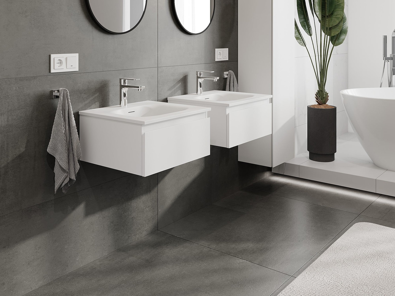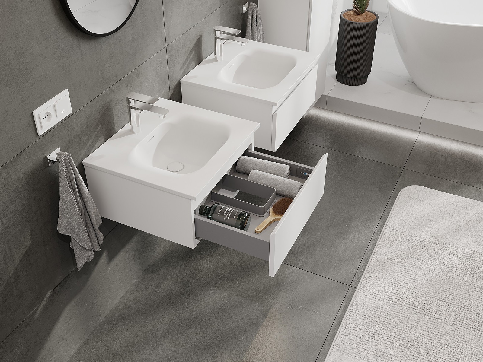 Unsere modularen Badezimmermöbel können in verschiedenen Farbkonfigurationen miteinander kombiniert werden, wodurch eine vollständige Personalisierung ermöglicht wird. Man kann sowohl das Aussehen als auch die Funktionen der einzelnen Elemente auswählen, was es erlaubt, die Möbel an eigene stilistische und funktionale Vorlieben anzupassen.