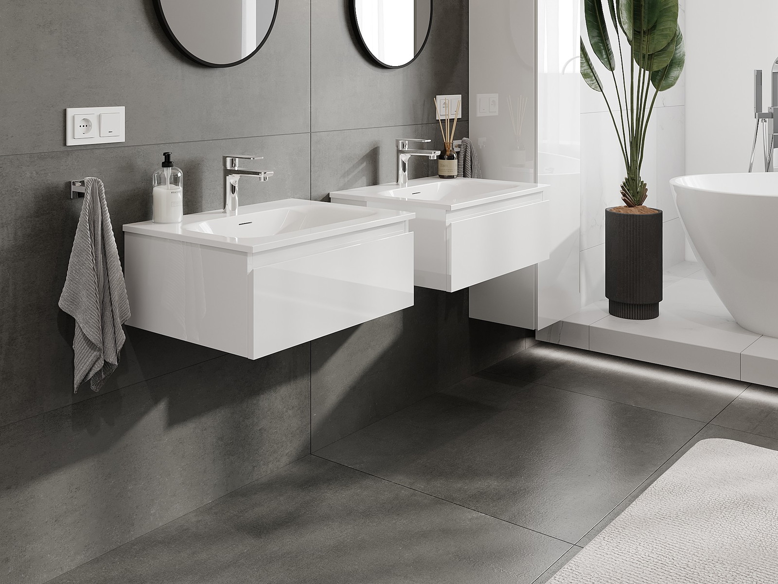 Unsere modularen Badezimmermöbel können in verschiedenen Farbkonfigurationen miteinander kombiniert werden, wodurch eine vollständige Personalisierung ermöglicht wird. Man kann sowohl das Aussehen als auch die Funktionen der einzelnen Elemente auswählen, was es erlaubt, die Möbel an eigene stilistische und funktionale Vorlieben anzupassen.