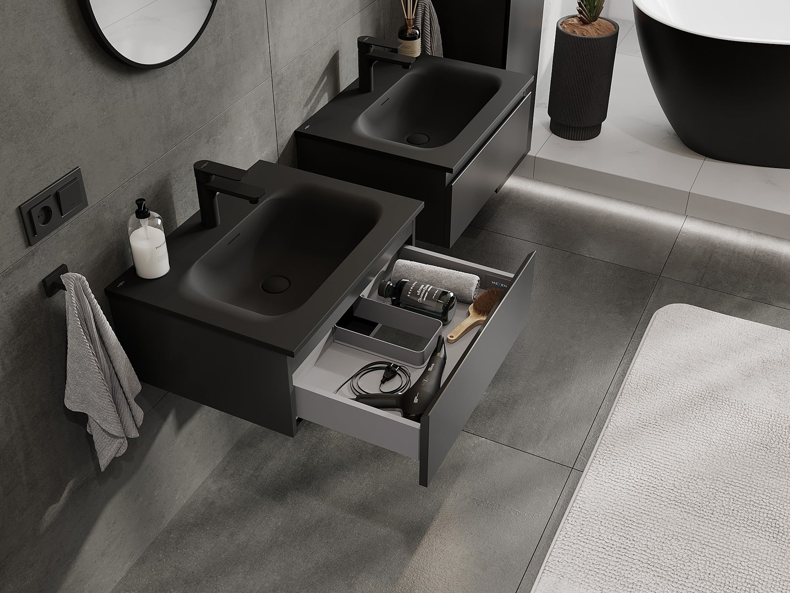 Mexen Orio 60 cm Badezimmerschrank mit Waschbecken Vela, 1 Schublade, Schwarz Matt - 91A10-06023-1-BF71-W23M71