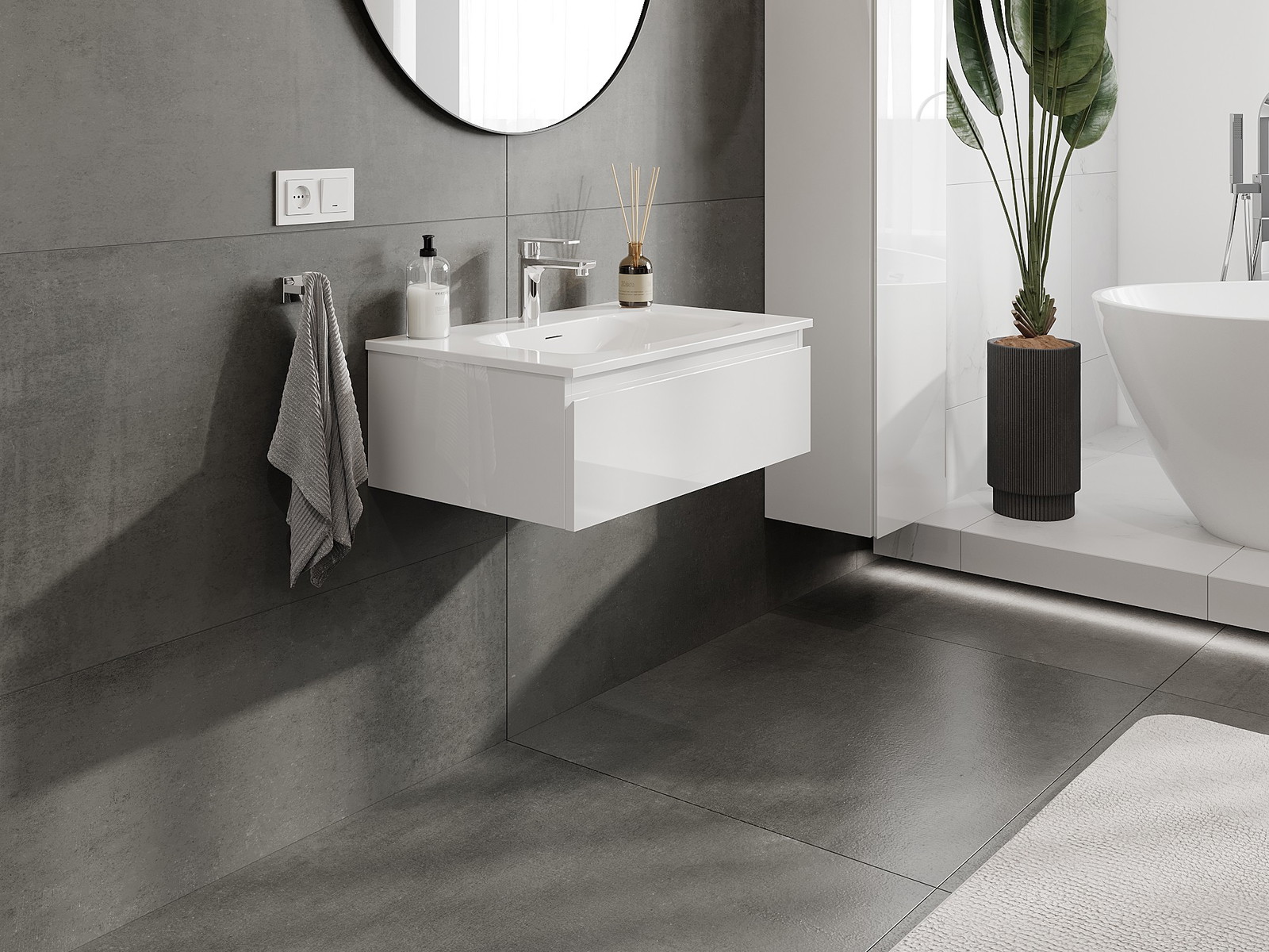 Das Waschbecken verfügt über eine Öffnung, in der wir eine Armatur montieren können. Dies spart wertvollen Platz im Badezimmer und unterstreicht dessen Ästhetik. Diese Lösung ermöglicht auch eine einfachere Reinigung rund um das Waschbecken.