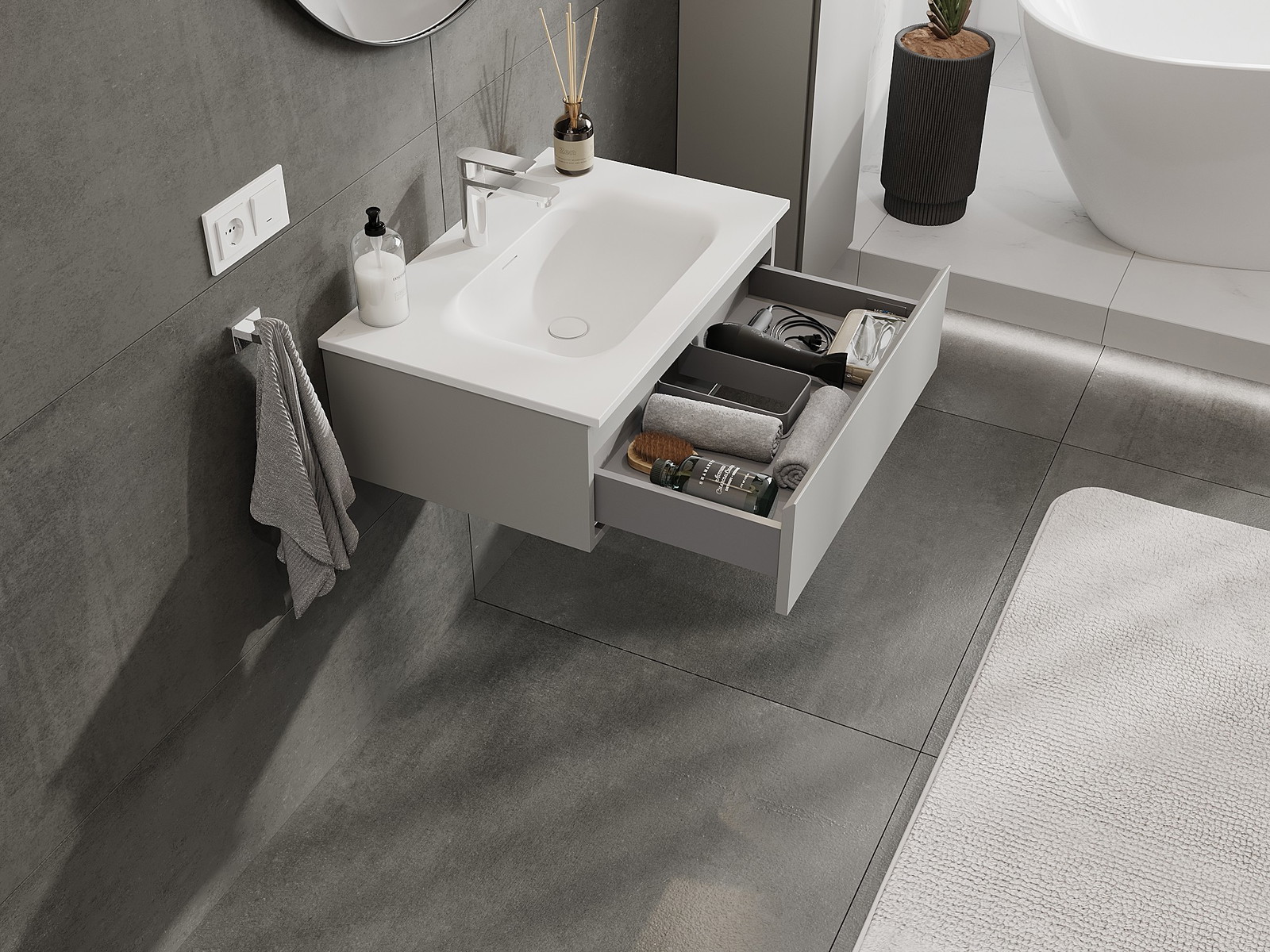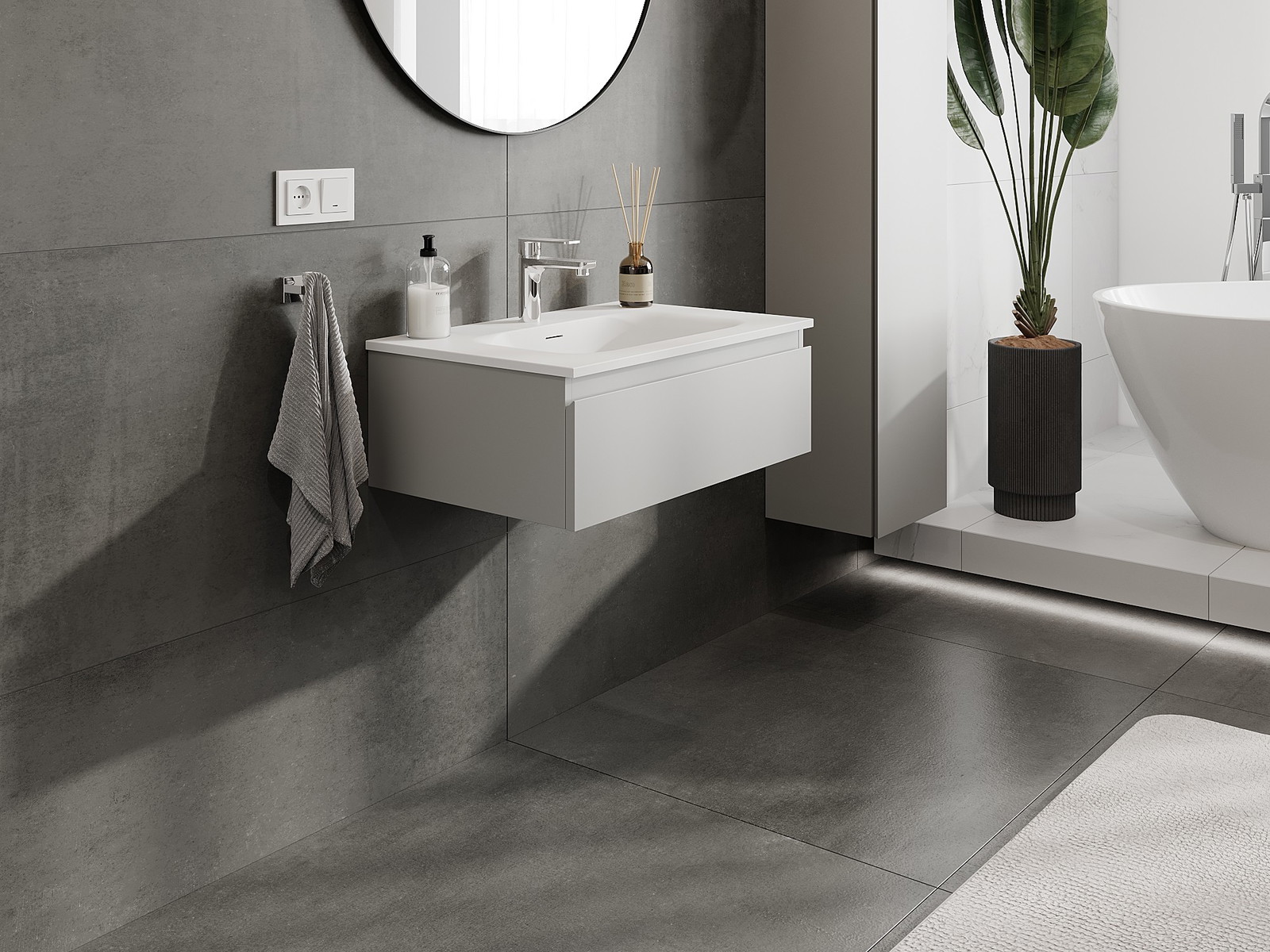 Unsere modularen Badezimmermöbel können in verschiedenen Farbkonfigurationen miteinander kombiniert werden, wodurch eine vollständige Personalisierung ermöglicht wird. Man kann sowohl das Aussehen als auch die Funktionen der einzelnen Elemente auswählen, was es erlaubt, die Möbel an eigene stilistische und funktionale Vorlieben anzupassen.