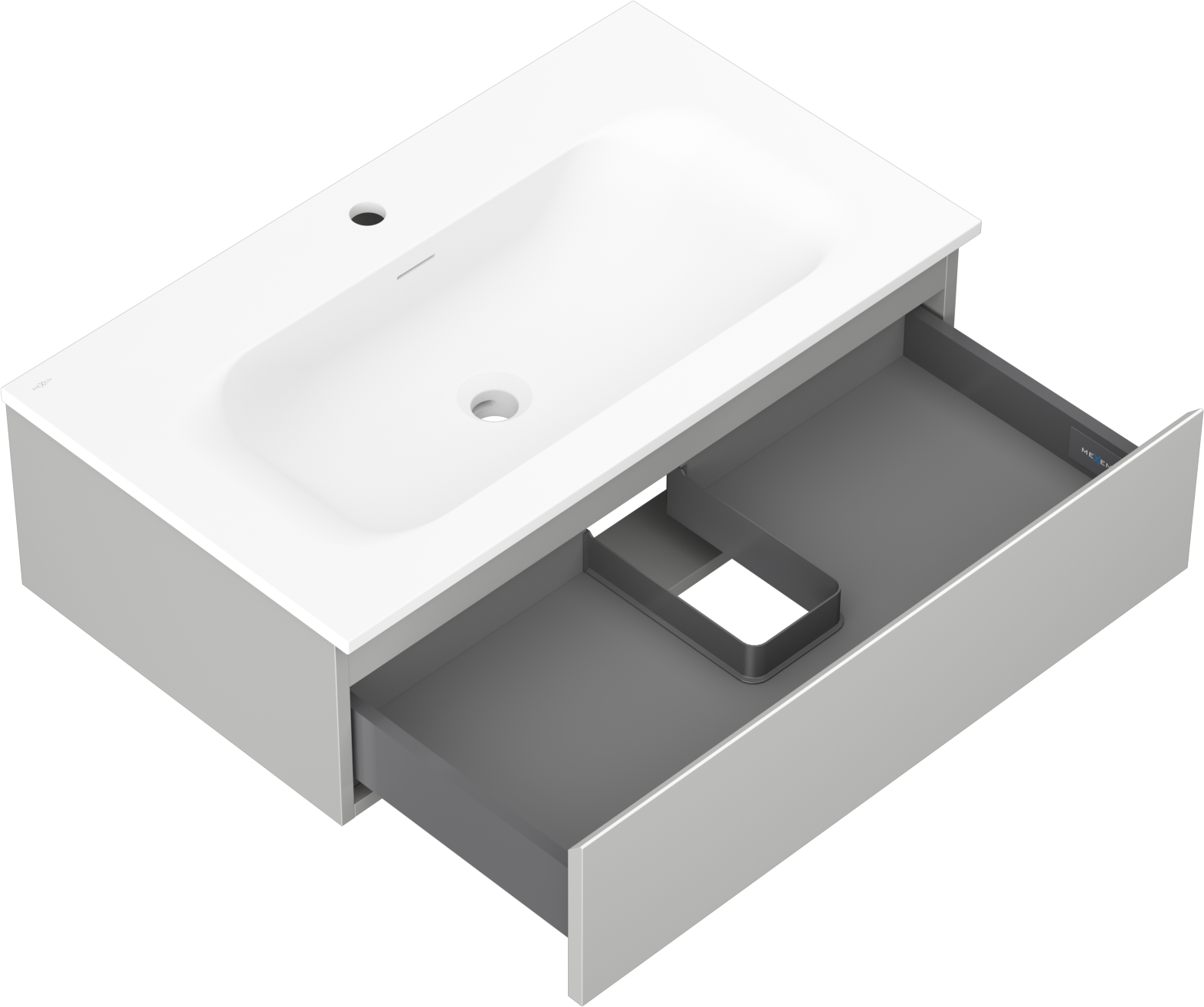 Der Ausschnitt in der Schublade ist so gestaltet, dass er den Siphon aufnehmen kann, der für Waschbeckeninstallationen erforderlich ist. Dadurch kann das Möbelstück voll funktionsfähig montiert werden, ohne auf den Platz in der Schublade zugunsten der Installation verzichten zu müssen.