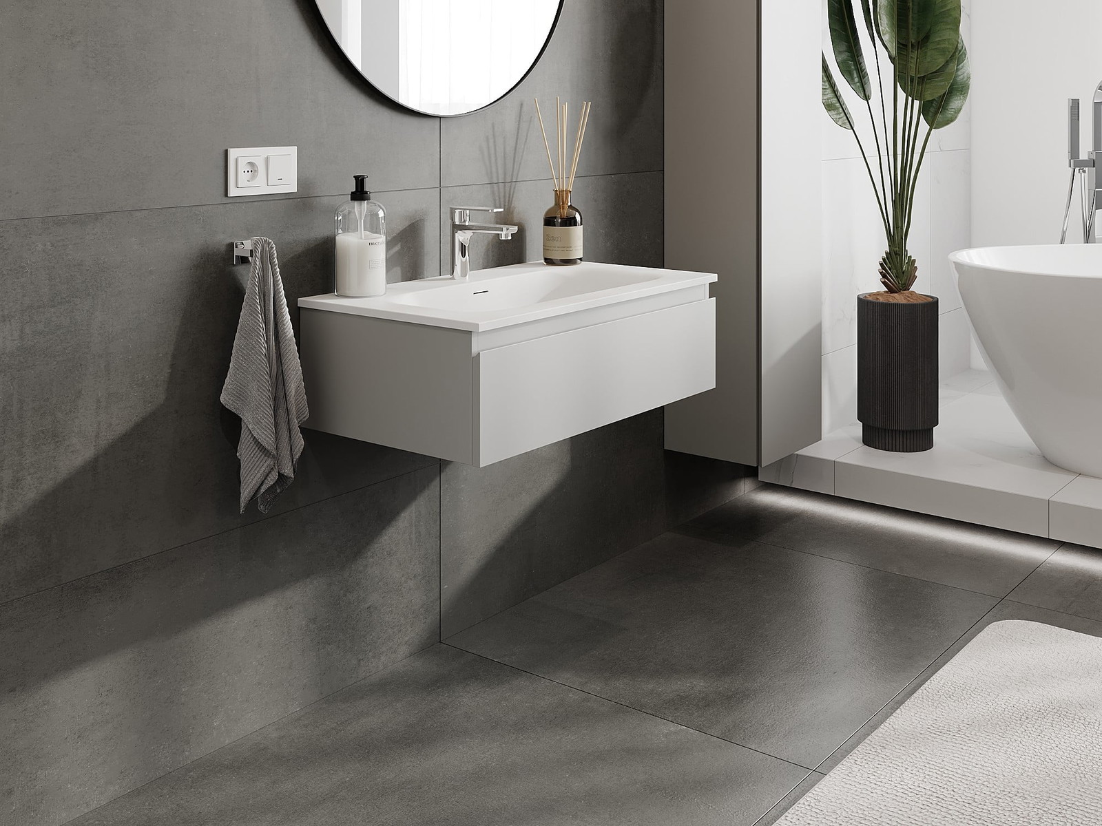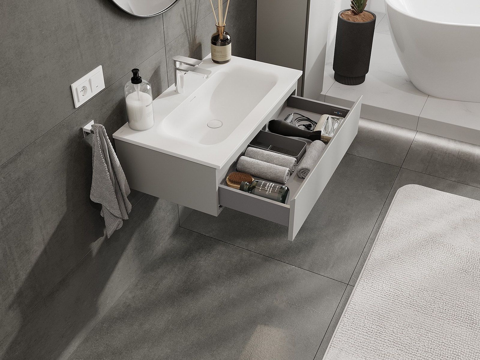 Unsere modularen Badezimmermöbel können in verschiedenen Farbkonfigurationen miteinander kombiniert werden, wodurch eine vollständige Personalisierung ermöglicht wird. Man kann sowohl das Aussehen als auch die Funktionen der einzelnen Elemente auswählen, was es erlaubt, die Möbel an eigene stilistische und funktionale Vorlieben anzupassen.