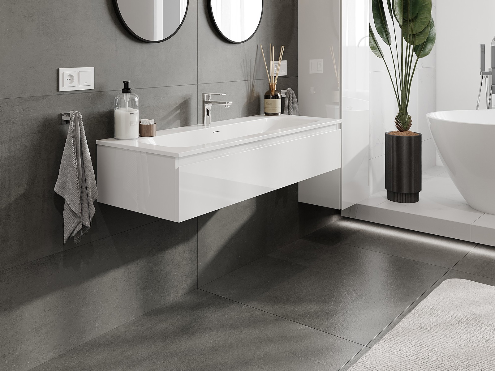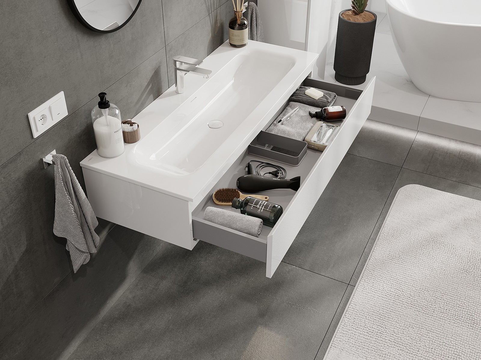 Unsere modularen Badezimmermöbel können in verschiedenen Farbkonfigurationen miteinander kombiniert werden, wodurch eine vollständige Personalisierung ermöglicht wird. Man kann sowohl das Aussehen als auch die Funktionen der einzelnen Elemente auswählen, was es erlaubt, die Möbel an eigene stilistische und funktionale Vorlieben anzupassen.