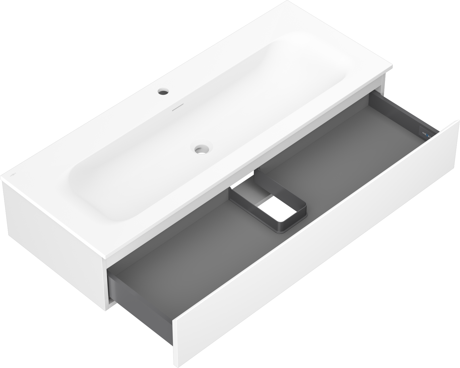 Der Ausschnitt in der Schublade ist so gestaltet, dass er den Siphon aufnehmen kann, der für Waschbeckeninstallationen erforderlich ist. Dadurch kann das Möbelstück voll funktionsfähig montiert werden, ohne auf den Platz in der Schublade zugunsten der Installation verzichten zu müssen.