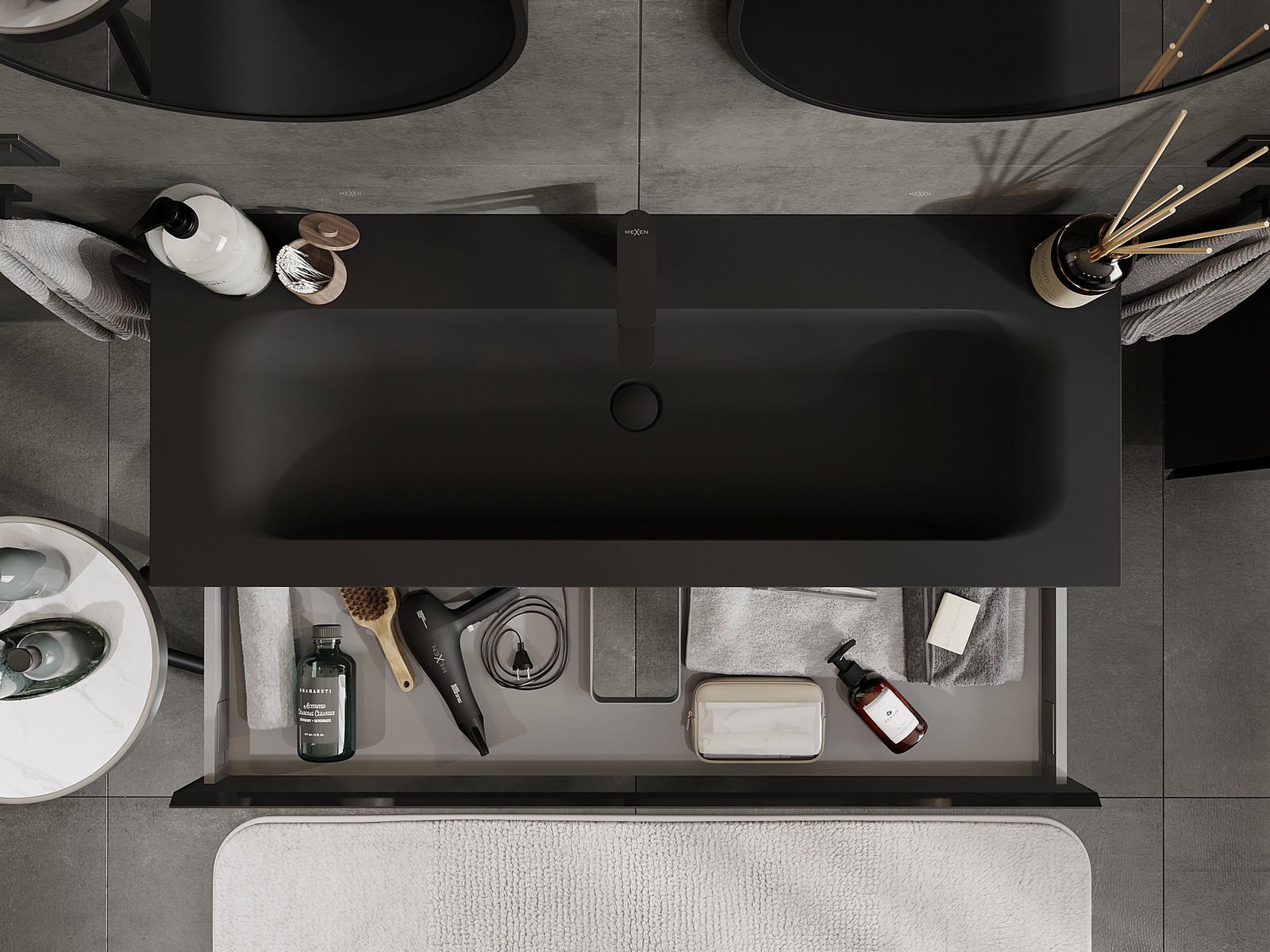 Mexen Orio Badezimmerschrank 120 cm mit Waschbecken Vela, 1 Schublade, schwarz glänzend/schwarz matt