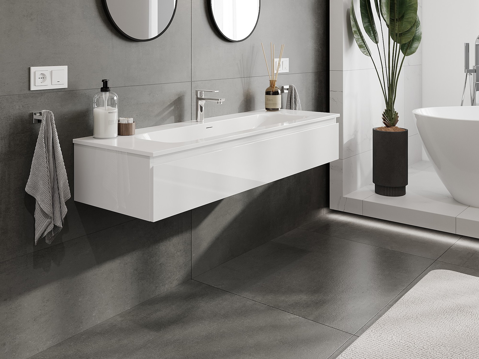 Mexen Orio Badezimmerschrank 140 cm mit Waschbecken Vela, 1 Schublade, weißer Glanz - 91A10-14023-1-BF00-W23M00