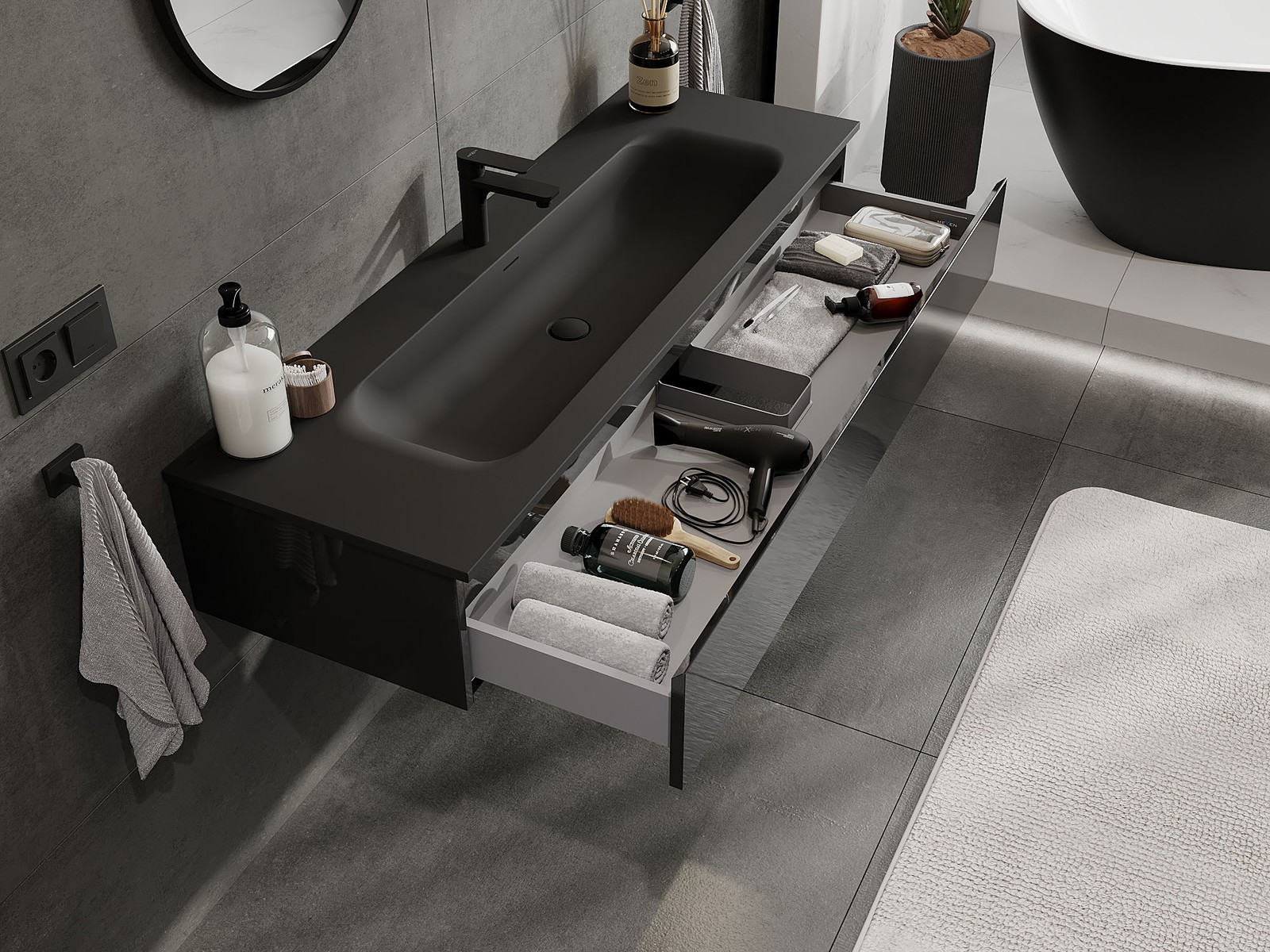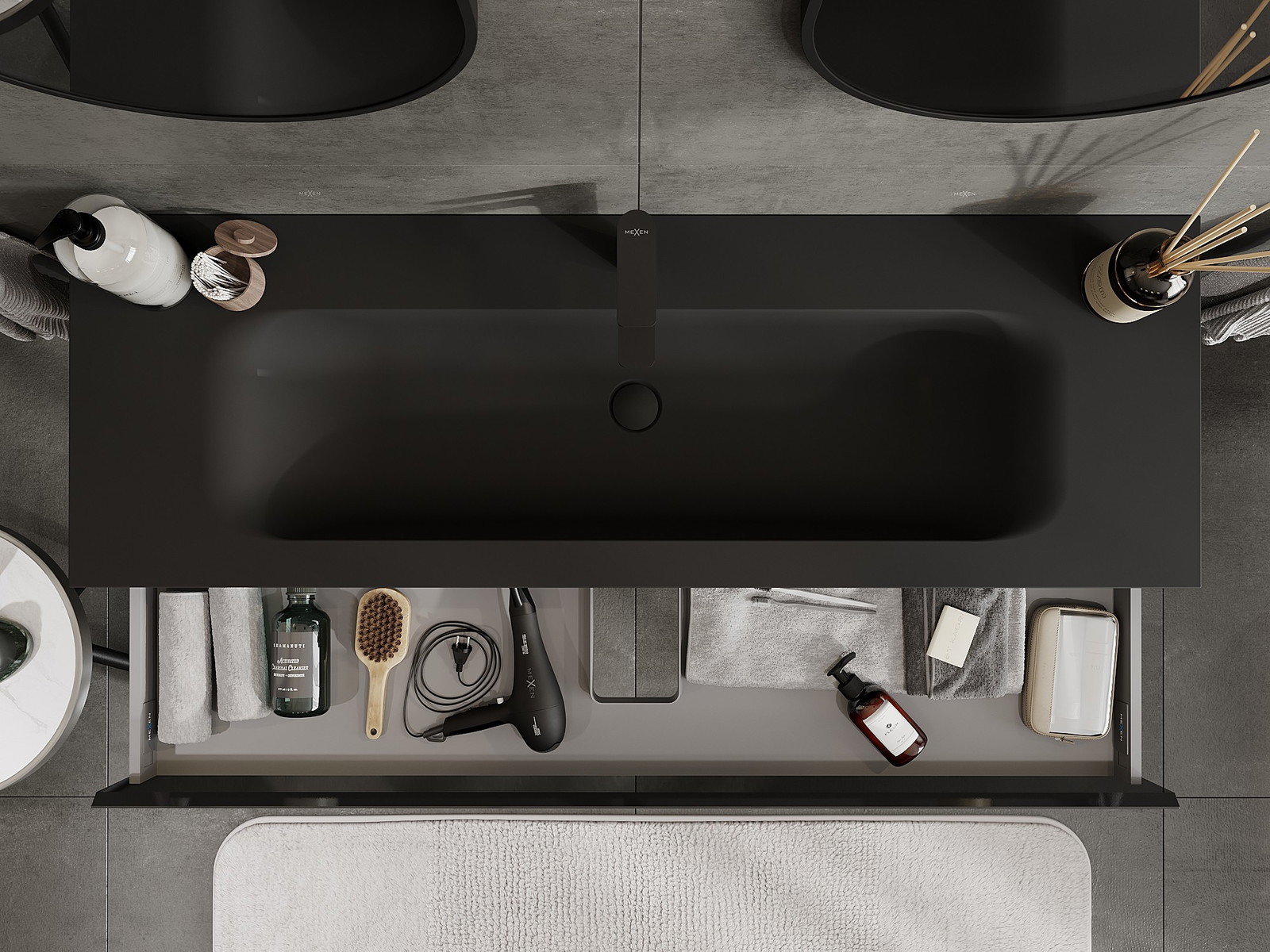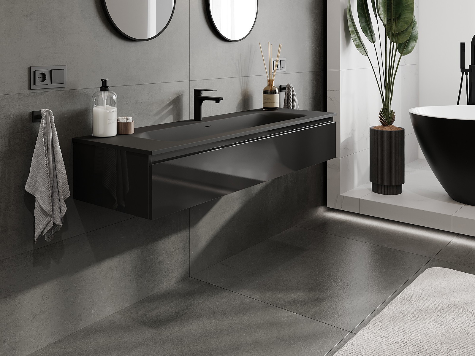 Mexen Orio 140 cm Badezimmerschrank mit Waschbecken Vela, 1 Schublade, Schwarz Hochglanz/Schwarz Matt