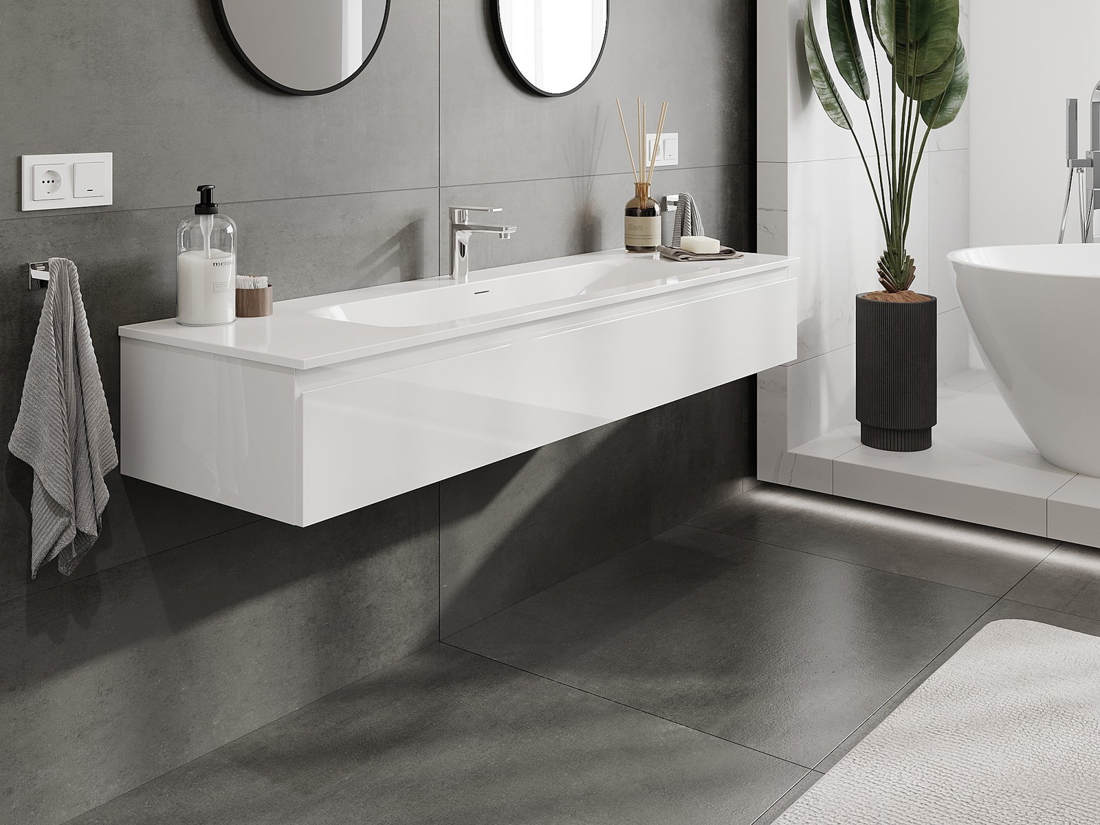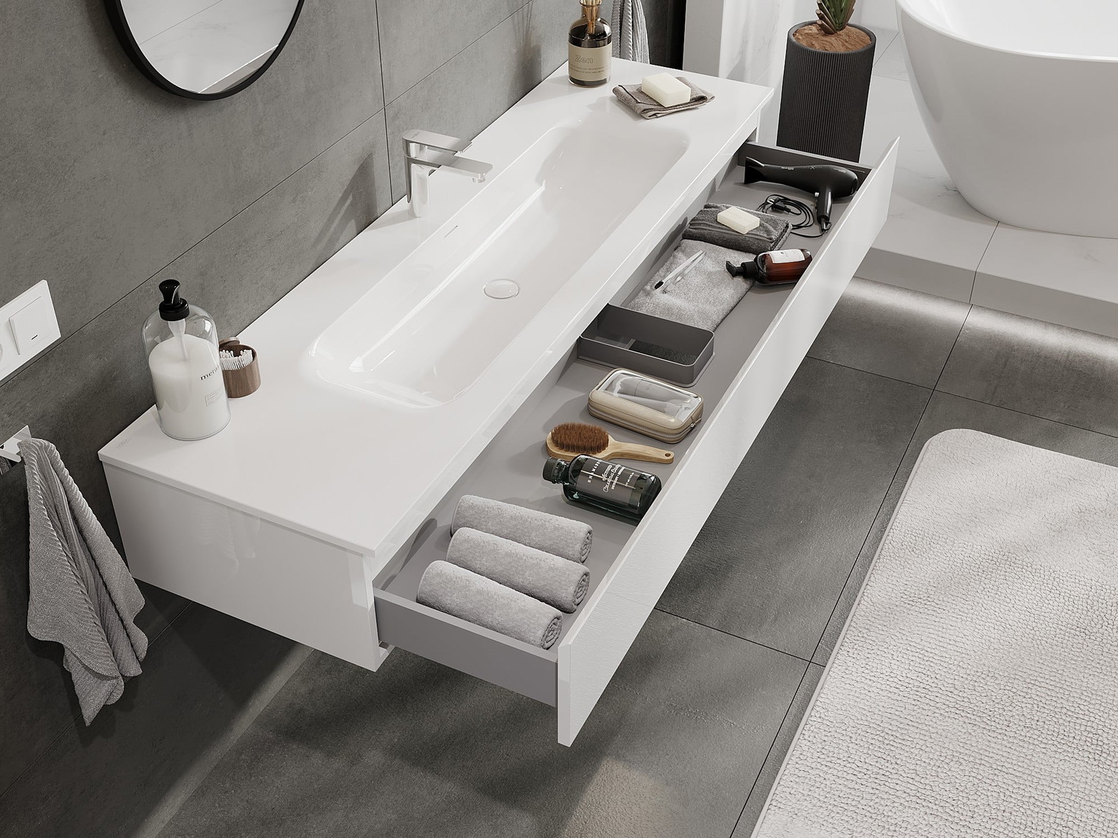 Unsere modularen Badezimmermöbel können in verschiedenen Farbkonfigurationen miteinander kombiniert werden, wodurch eine vollständige Personalisierung ermöglicht wird. Man kann sowohl das Aussehen als auch die Funktionen der einzelnen Elemente auswählen, was es erlaubt, die Möbel an eigene stilistische und funktionale Vorlieben anzupassen.