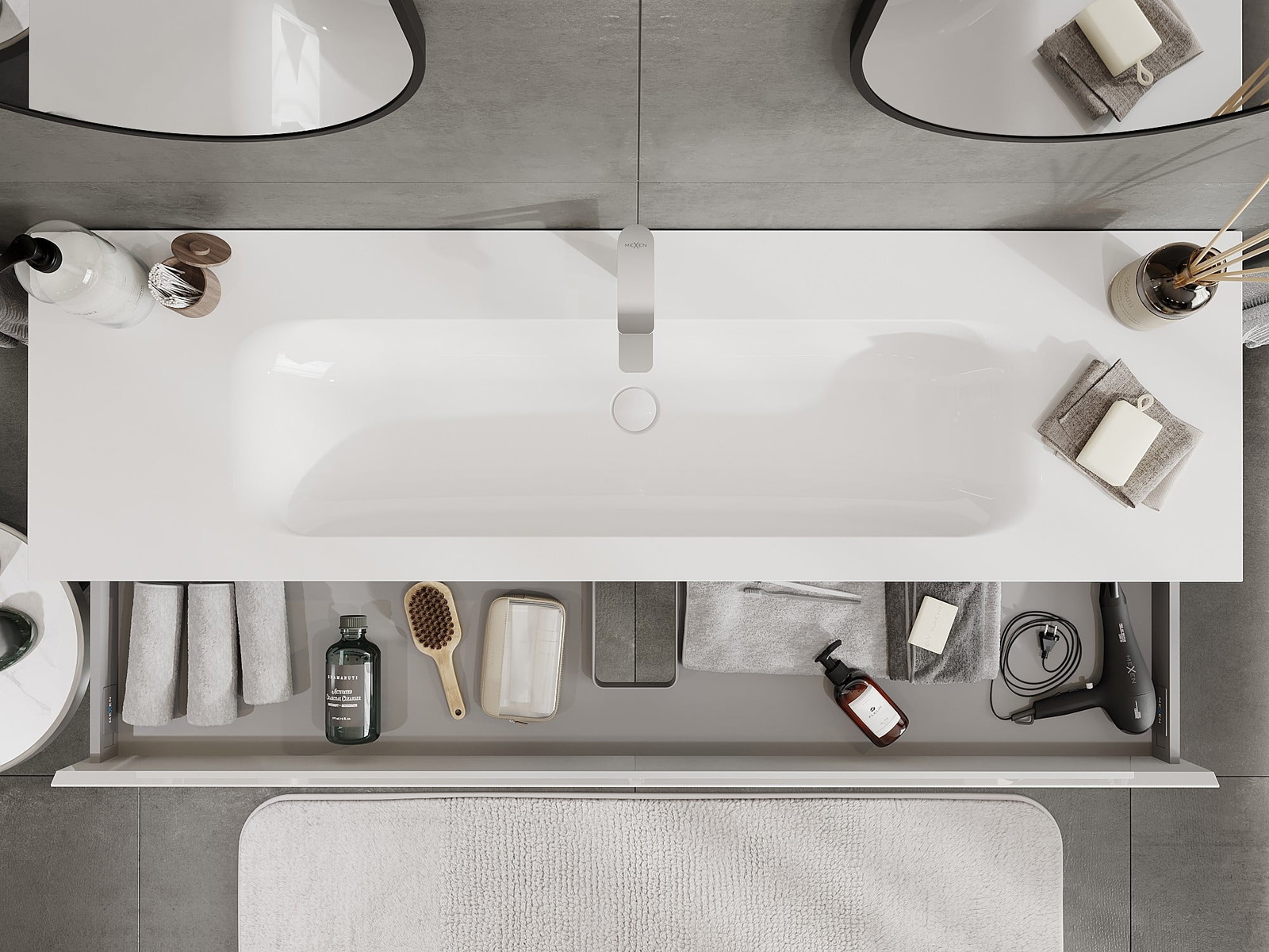 Mexen Orio Badezimmerschrank 160 cm mit Waschbecken Vela, 1 Schublade, weiß glänzend - 91A10-16023-1-BF00-W23M00