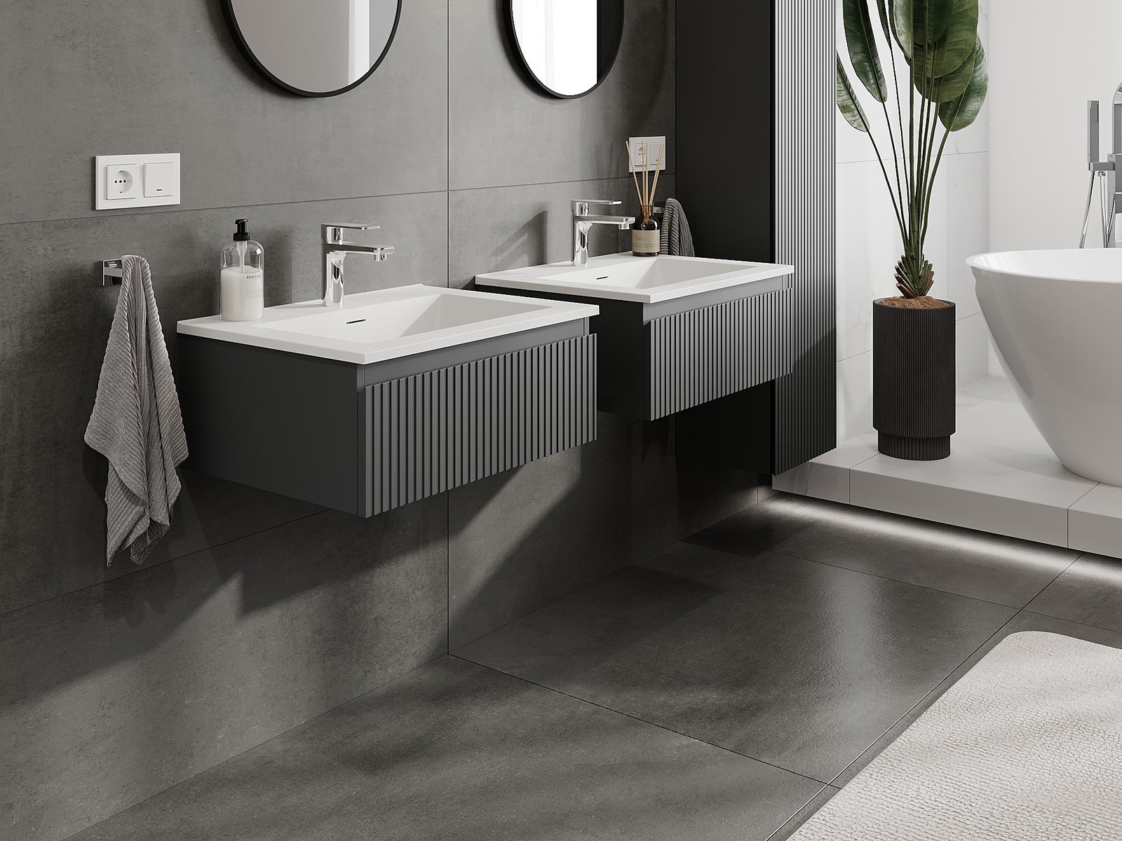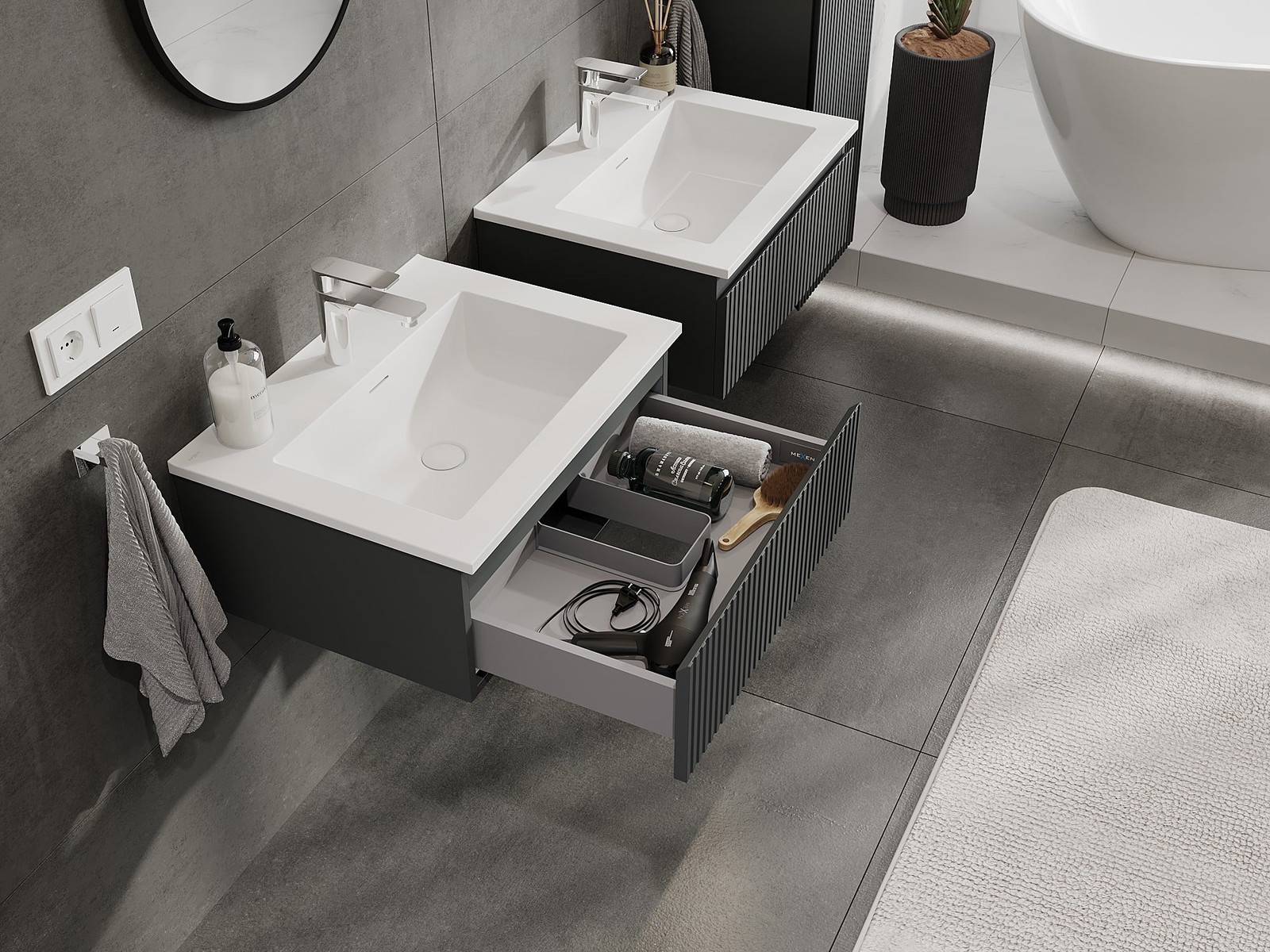 Mexen Rivel Badezimmerschrank 60 cm mit Waschbecken Otis, 1 Schublade, geriffelt, Graphit matt/Weiß matt